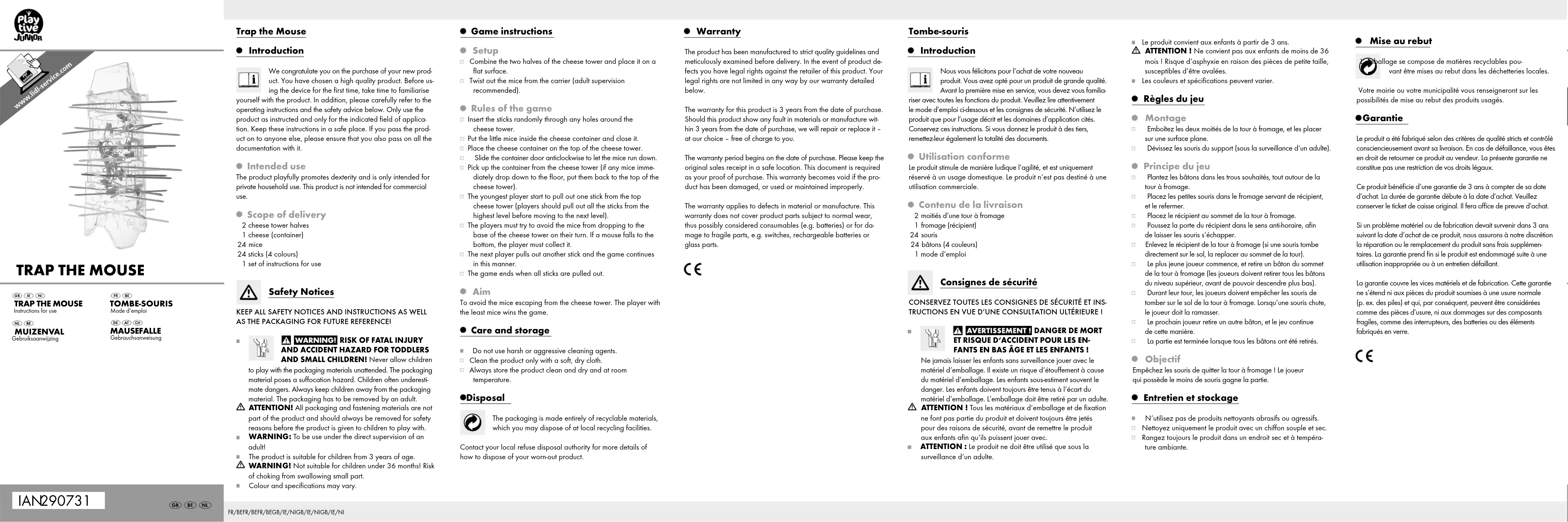 Instructions for use Warranty The product has been manufactured to strict quality guidelines and meticulously examined before delivery. In the event of product de- fects you have legal rights against the retailer of this product. Your legal rights are not limited in any way by our warranty detailed below. The warranty for this product is 3 years from the date of purchase. Should this product show any fault in materials or manufacture wit- hin 3 years from the date of purchase, we will repair or replace it – at our choice – free of charge to you. The warranty period begins on the date of purchase. Please keep the original sales receipt in a safe location. This document is required as your proof of purchase. This warranty becomes void if the pro- duct has been damaged, or used or maintained improperly. The warranty applies to defects in material or manufacture. This warranty does not cover product parts subject to normal wear, thus possibly considered consumables (e.g. batteries) or for da- mage to fragile parts, e.g. switches, rechargeable batteries or glass parts. Mise au rebut L’emballage se compose de matières recyclables pou- vant être mises au rebut dans les déchetteries locales. Votre mairie ou votre municipalité vous renseigneront sur les possibilités de mise au rebut des produits usagés. Garantie Le produit a été fabriqué selon des critères de qualité stricts et contrôlé consciencieusement avant sa livraison. En cas de défaillance, vous êtes en droit de retourner ce produit au vendeur. La présente garantie ne constitue pas une restriction de vos droits légaux. Ce produit bénéficie d‘une garantie de 3 ans à compter de sa date d’achat. La durée de garantie débute à la date d’achat. Veuillez conserver le ticket de caisse original. Il fera office de preuve d’achat. Si un problème matériel ou de fabrication devait survenir dans 3 ans suivant la date d‘achat de ce produit, nous assurons à notre discrétion la réparation ou le remplacement du produit sans frais supplémen- taires. La garantie prend fin si le produit est endommagé suite à une utilisation inappropriée ou à un entretien défaillant. La garantie couvre les vices matériels et de fabrication. Cette garantie ne s’étend ni aux pièces du produit soumises à une usure normale (p. ex. des piles) et qui, par conséquent, peuvent être considérées comme des pièces d’usure, ni aux dommages sur des composants fragiles, comme des interrupteurs, des batteries ou des éléments fabriqués en verre. Game instructions Setup Combine the two halves of the cheese tower and place it on a flat surface. Twist out the mice from the carrier (adult supervision recommended). Rules of the game Insert the sticks randomly through any holes around the cheese tower. Put the little mice inside the cheese container and close it. Place the cheese container on the top of the cheese tower. Slide the container door anticlockwise to let the mice run down. Pick up the container from the cheese tower (if any mice imme- diately drop down to the floor, put them back to the top of the cheese tower). The youngest player start to pull out one stick from the top cheese tower (players should pull out all the sticks from the highest level before moving to the next level). The players must try to avoid the mice from dropping to the base of the cheese tower on their turn. If a mouse falls to the bottom, the player must collect it. The next player pulls out another stick and the game continues in this manner. The game ends when all sticks are pulled out. Aim To avoid the mice escaping from the cheese tower. The player with the least mice wins the game. Care and storage Do not use harsh or aggressive cleaning agents. Clean the product only with a soft, dry cloth. Always store the product clean and dry and at room temperature. Disposal The packaging is made entirely of recyclable materials, which you may dispose of at local recycling facilities. Contact your local refuse disposal authority for more details of how to dispose of your worn-out product. Le produit convient aux enfants à partir de 3 ans. ATTENTION ! Ne convient pas aux enfants de moins de 36 mois ! Risque d‘asphyxie en raison des pièces de petite taille, susceptibles d‘être avalées. Les couleurs et spécifications peuvent varier. Règles du jeu Montage Emboîtez les deux moitiés de la tour à fromage, et les placer sur une surface plane. Dévissez les souris du support (sous la surveillance d‘un adulte). Principe du jeu Plantez les bâtons dans les trous souhaités, tout autour de la tour à fromage. Placez les petites souris dans le fromage servant de récipient, et le refermer. Placez le récipient au sommet de la tour à fromage. Poussez la porte du récipient dans le sens anti-horaire, afin de laisser les souris s‘échapper. Enlevez le récipient de la tour à fromage (si une souris tombe directement sur le sol, la replacer au sommet de la tour). Le plus jeune joueur commence, et retire un bâton du sommet de la tour à fromage (les joueurs doivent retirer tous les bâtons du niveau supérieur, avant de pouvoir descendre plus bas). Durant leur tour, les joueurs doivent empêcher les souris de tomber sur le sol de la tour à fromage. Lorsqu‘une souris chute, le joueur doit la ramasser. Le prochain joueur retire un autre bâton, et le jeu continue de cette manière. La partie est terminée lorsque tous les bâtons ont été retirés. Objectif Empêchez les souris de quitter la tour à fromage ! Le joueur qui possède le moins de souris gagne la partie. Entretien et stockage N‘utilisez pas de produits nettoyants abrasifs ou agressifs. Nettoyez uniquement le produit avec un chiffon souple et sec. Rangez toujours le produit dans un endroit sec et à tempéra- ture ambiante. Trap the Mouse Introduction We congratulate you on the purchase of your new prod- uct. You have chosen a high quality product. Before us- ing the device for the first time,