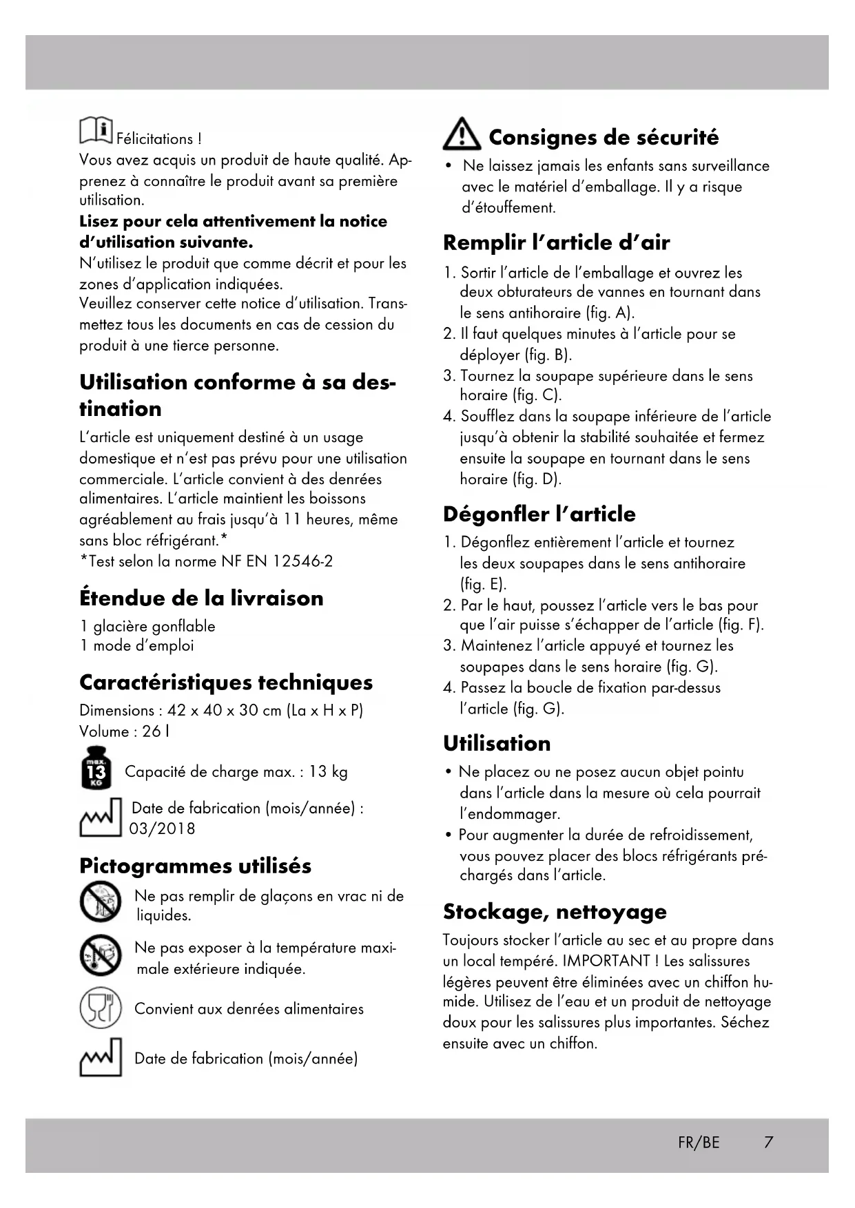 - s‘il présente les qualités qu‘un acheteur peut légitimement attendre eu égard aux décla- rations publiques faites par le vendeur, par le producteur ou par son représentant, notam- ment dans la publicité ou l‘étiquetage ;9 2° Ou s‘il présente les caractéristiques définies d‘un commun accord par les parties ou être propre à tout usage spécial recherché par l‘acheteur, porté à la connaissance du vendeur et que ce dernier a accepté. Article L217-12 du Code de la consommation L‘action résultant du défaut de conformité se prescrit par deux ans à compter de la délivrance du bien. Article 1641 du Code civil Le vendeur est tenu de la garantie à raison des défauts cachés de la chose vendue qui la rendent impropre à l‘usage auquel on la destine, ou qui diminuent tellement cet usage que l‘acheteur ne l‘aurait pas acquise, ou n‘en aurait donné qu‘un moindre prix, s‘il les avait connus. Article 1648 1er alinéa du Code civil L‘action résultant des vices rédhibitoires doit être intentée par l‘acquéreur dans un délai de deux ans à compter de la découverte du vice. Les pièces détachées indispensables à l’utilisation du produit sont disponibles pendant la durée de la garantie du produit. IAN : 290759 Service Belgique Tel. : 070 270 171 (0,15 EUR/Min.) E-Mail : deltasport@lidl.be FR/BE10 Hartelijk gefeliciteerd! Met de aankoop hebt u gekozen voor een hoog- waardig product. Maak u daarom voor de eerste ingebruikname vertrouwd met het product. Lees hiervoor deze gebruiksaanwijzing aandachtig door. Gebruik het product alleen zoals beschreven en uitsluitend voor de aangegeven doeleinden. Be- waar de handleiding zorgvuldig. Als u het product aan derden geeft, dient u ook deze documenten te overhandigen. Beoogd gebruik Dit artikel is uitsluitend bestemd voor privégebruik binnenshuis en niet voor zakelijk gebruik. Het artikel is geschikt voor levensmiddelen. Het houdt dranken ook zonder koelaccu tot 11 uur lekker fris.* *Test volgens de norm EN 12546-2 Leveringsomvang 1 x opblaasbare koeltas 1 x gebruiksaanwijzing Technische gegevens Afmetingen: 42 x 40 x 30 cm (b x h x d) Volume: 26 l
