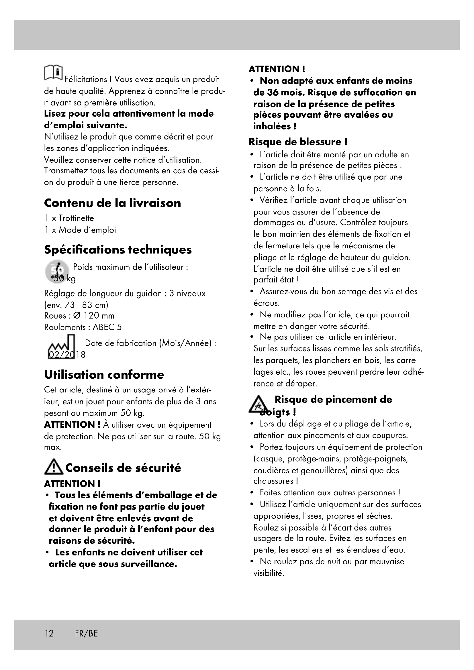 - s‘il présente les qualités qu‘un acheteur peut légitimement attendre eu égard aux décla- rations publiques faites par le vendeur, par le producteur ou par son représentant, notam- ment dans la publicité ou l‘étiquetage ; 2° Ou s‘il présente les caractéristiques définies d‘un commun accord par les parties ou être propre à tout usage spécial recherché par l‘acheteur, porté à la connaissance du vendeur et que ce dernier a accepté. Article L217-12 du Code de la consommation L‘action résultant du défaut de conformité se prescrit par deux ans à compter de la délivrance du bien. Article 1641 du Code civil Le vendeur est tenu de la garantie à raison des défauts cachés de la chose vendue qui la ren- dent impropre à l‘usage auquel on la destine, ou qui diminuent tellement cet usage que l‘acheteur ne l‘aurait pas acquise, ou n‘en aurait donné qu‘un moindre prix, s‘il les avait connus. Article 1648 1er alinéa du Code civil L‘action résultant des vices rédhibitoires doit être intentée par l‘acquéreur dans un délai de deux ans à compter de la découverte du vice. Les pièces détachées indispensables à l’utilisation du produit sont disponibles pendant la durée de la garantie du produit. IAN : 297400 Service Belgique Tel. : 070 270 171 (0,15 EUR/Min.) E-Mail : deltasport@lidl.be FR/BE16 NL/BE Hartelijk gefeliciteerd! Met de aankoop hebt u gekozen voor een hoogwaardig product. Maak u daarom voor de eerste ingebruikname vertrouwd met het product. Lees hiervoor deze gebruiksaanwijzing aandachtig door. Gebruik het product alleen zoals beschreven en uitsluitend voor de aangegeven doeleinden. Bewaar de gebruiksaanwijzing zorgvuldig. Als u het product aan derden geeft, dient u ook deze documenten te overhandigen. Omvang van de levering 1 x Step 1 x Gebruiksaanwijzing Technische gegevens Maximaal gebruikersgewicht: 50 kg Uittrekhoogte stuur: 3-traps (ca. 73 - 83 cm) Wielen: Ø 120 mm Lagers: ABEC 5 Productiedatum (maand/jaar): 02/2018 Doelmatig gebruik Bij dit artikel gaat het om speelgoed voor kinderen ouder dan 3 jaar met een maximaal gebruikersgewicht van 50 kg, buiten voor privé- doeleinden te gebruiken. ATTENTIE! Met beschermende uitrusting gebruiken. Niet in het wegverkeer gebruiken. Max. 50 kg. Veiligheidsinstructies LET OP!