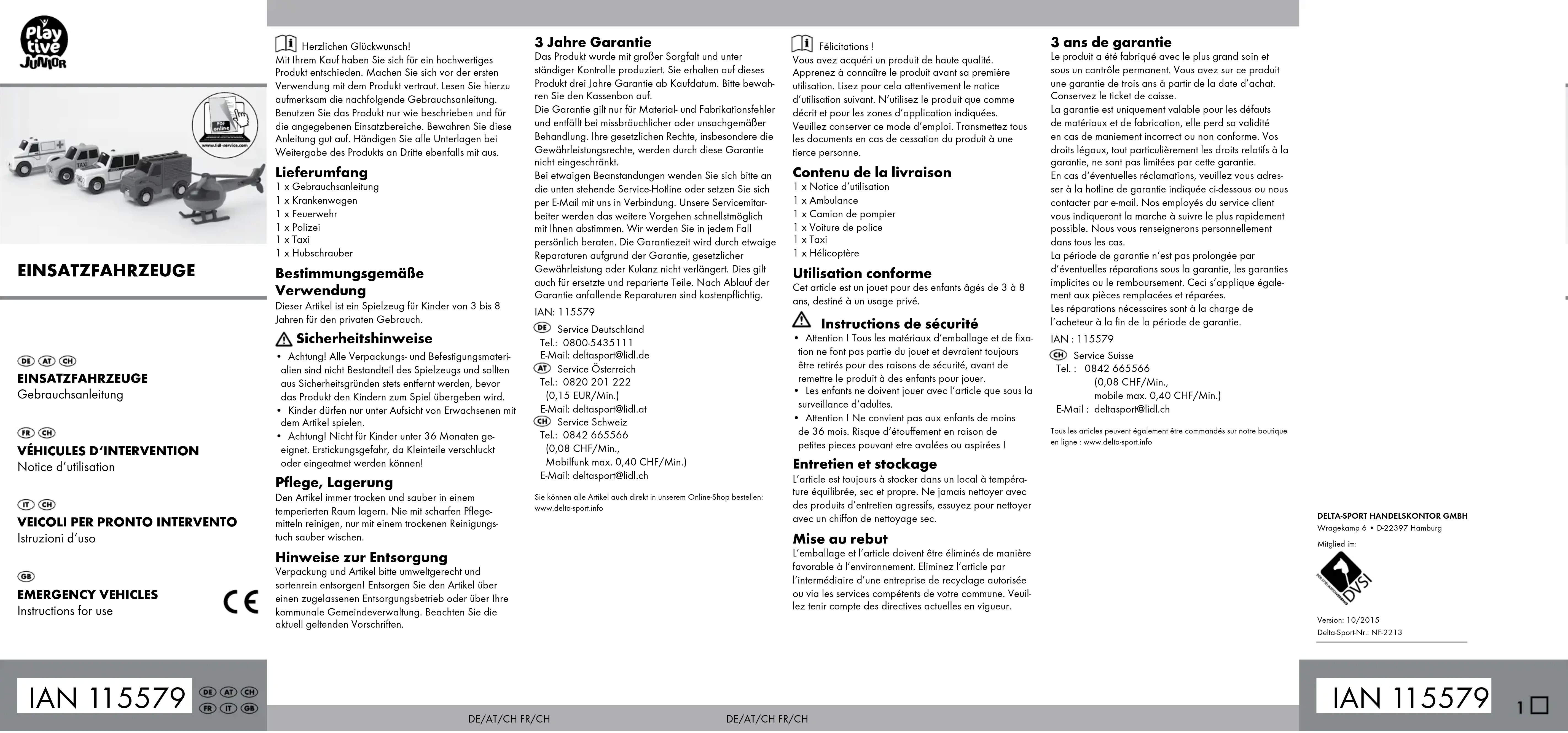 - Attention ! Ne convient pas aux enfants de moins de 36 mois. Risque d‘étouffement en raison de petites pieces pouvant etre avalées ou aspirées ! Entretien et stockage L’article est toujours à stocker dans un local à tempéra- ture équilibrée, sec et propre. Ne jamais nettoyer avec des produits d’entretien agressifs, essuyez pour nettoyer avec un chiffon de nettoyage sec. Mise au rebut L’emballage et l’article doivent être éliminés de manière favorable à l’environnement. Eliminez l’article par l’intermédiaire d’une entreprise de recyclage autorisée ou via les services compétents de votre commune. Veuil- lez tenir compte des directives actuelles en vigueur. 3 ans de garantie Le produit a été fabriqué avec le plus grand soin et sous un contrôle permanent. Vous avez sur ce produit une garantie de trois ans à partir de la date d’achat. Conservez le ticket de caisse. La garantie est uniquement valable pour les défauts de matériaux et de fabrication, elle perd sa validité en cas de maniement incorrect ou non conforme. Vos droits légaux, tout particulièrement les droits relatifs à la garantie, ne sont pas limitées par cette garantie. En cas d‘éventuelles réclamations, veuillez vous adres- ser à la hotline de garantie indiquée ci-dessous ou nous contacter par e-mail. Nos employés du service client vous indiqueront la marche à suivre le plus rapidement possible. Nous vous renseignerons personnellement dans tous les cas. La période de garantie n‘est pas prolongée par d’éventuelles réparations sous la garantie, les garanties implicites ou le remboursement. Ceci s‘applique égale- ment aux pièces remplacées et réparées. Les réparations nécessaires sont à la charge de l’acheteur à la fin de la période de garantie. IAN : 115579 Service Suisse Tel. : 0842 665566 (0,08 CHF/Min., mobile max. 0,40 CHF/Min.) E-Mail : deltasport@lidl.ch Tous les articles peuvent également être commandés sur notre boutique en ligne : www.delta-sport.info