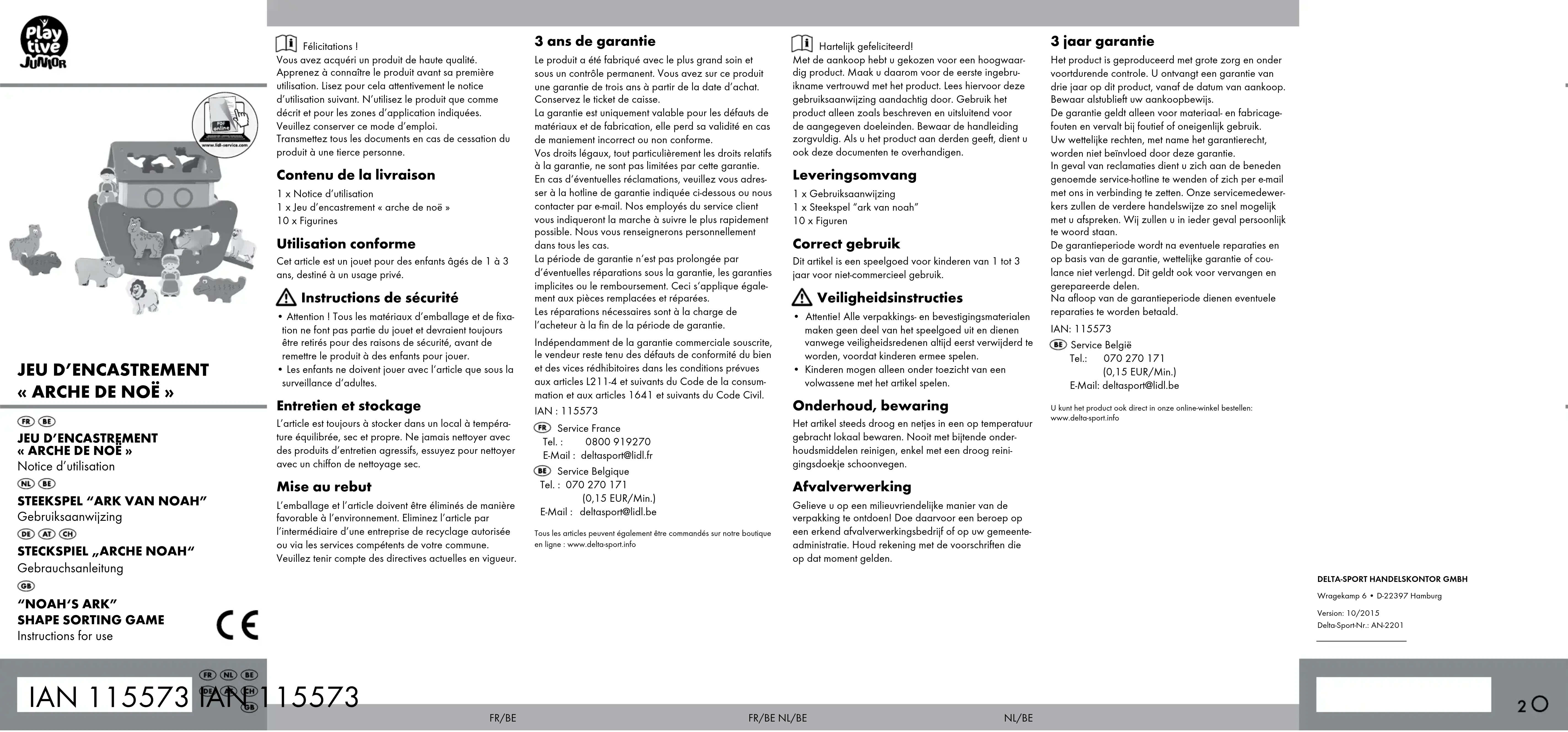 - Les enfants ne doivent jouer avec l‘article que sous la surveillance d‘adultes. Entretien et stockage L’article est toujours à stocker dans un local à tempéra- ture équilibrée, sec et propre. Ne jamais nettoyer avec des produits d’entretien agressifs, essuyez pour nettoyer avec un chiffon de nettoyage sec. Mise au rebut L’emballage et l’article doivent être éliminés de manière favorable à l’environnement. Eliminez l’article par l’intermédiaire d’une entreprise de recyclage autorisée ou via les services compétents de votre commune. Veuillez tenir compte des directives actuelles en vigueur. 3 ans de garantie Le produit a été fabriqué avec le plus grand soin et sous un contrôle permanent. Vous avez sur ce produit une garantie de trois ans à partir de la date d’achat. Conservez le ticket de caisse. La garantie est uniquement valable pour les défauts de matériaux et de fabrication, elle perd sa validité en cas de maniement incorrect ou non conforme. Vos droits légaux, tout particulièrement les droits relatifs à la garantie, ne sont pas limitées par cette garantie. En cas d‘éventuelles réclamations, veuillez vous adres- ser à la hotline de garantie indiquée ci-dessous ou nous contacter par e-mail. Nos employés du service client vous indiqueront la marche à suivre le plus rapidement possible. Nous vous renseignerons personnellement dans tous les cas. La période de garantie n‘est pas prolongée par d’éventuelles réparations sous la garantie, les garanties implicites ou le remboursement. Ceci s‘applique égale- ment aux pièces remplacées et réparées. Les réparations nécessaires sont à la charge de l’acheteur à la fin de la période de garantie. Indépendamment de la garantie commerciale souscrite, le vendeur reste tenu des défauts de conformité du bien et des vices rédhibitoires dans les conditions prévues aux articles L211-4 et suivants du Code de la consum- mation et aux articles 1641 et suivants du Code Civil. IAN : 115573 Service France Tel. : 0800 919270 E-Mail : deltasport@lidl.fr Service Belgique Tel. : 070 270 171 (0,15 EUR/Min.) E-Mail : deltasport@lidl.be Tous les articles peuvent également être commandés sur notre boutique en ligne : www.delta-sport.info Hartelijk gefeliciteerd! Met de aankoop hebt u gekozen voor een hoogwaar- dig product. Maak u daarom voor de eerste ingebru- ikname vertrouwd met het product. Lees hiervoor deze gebruiksaanwijzing aandachtig door. Gebruik het product alleen zoals beschreven en uitsluitend voor de aangegeven doeleinden. Bewaar de handleiding zorgvuldig. Als u het product aan derden geeft, dient u ook deze documenten te overhandigen. Leveringsomvang 1 x Gebruiksaanwijzing 1 x Steekspel “ark van noah” 10 x Figuren Correct gebruik Dit artikel is een speelgoed voor kinderen van 1 tot 3 jaar voor niet-commercieel gebruik. Veiligheidsinstructies
