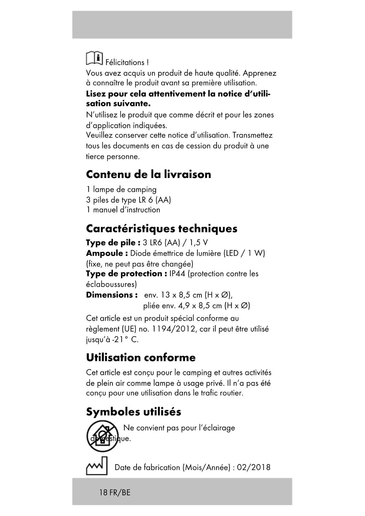 - Suspension (Fig. F) Pour utiliser la lampe suspendue, relevez le dispositif de suspension avec mousqueton (1d) de l’article (Fig. F). Rangement et entretien Toujours ranger l‘article propre et sec dans une pièce tempérée. Nettoyer uniquement avec de l‘eau, puis sécher avec un chiffon. IMPORTANT ! Ne pas nettoyer avec des nettoyants agressifs. Mise au rebut Éliminez l‘article et le matériel d‘emballage conformé- ment aux directives locales en vigueur. Le matériel d‘em- ballage tel que les sachets en plastique par exemple ne doivent pas arriver dans les mains des enfants. Conser- vez le matériel d‘emballage hors de portée des enfants. Ce produit est recyclable. Il est soumis à la responsabilité élargie du fabricant et est collecté séparément. FR/BE22 Les appareils qui portent le symbole ci-contre ne doivent pas être jetés avec les ordures ménagères. Vous êtes dans l‘obligation d‘éliminer séparément les appareils électriques et électroniques usagés. Informez-vous auprès de votre commune sur les possibilités d‘élimination réglementée. Avant de mettre l‘article au rebut, retirez la pile qui s‘y trouve. Consignes pour l’élimination des piles Attention ! Les piles sont des déchets spéciaux qui, conformément à la législation, ne doivent pas être jetés avec les ordures ménagères. Vous pouvez déposer gratuitement les batteries usagées dans les points de collecte communaux ou dans le commerce où des récipients de collecte spéciaux sont mis à disposition. Indications concernant la garantie et le service après-vente Le produit a été fabriqué avec le plus grand soin et sous un contrôle permanent. Vous avez sur ce produit une ga- rantie de trois ans à partir de la date d’achat. Conservez le ticket de caisse. La garantie est uniquement valable pour les défauts de matériaux et de fabrication, elle perd sa validité en cas de maniement incorrect ou non conforme. Vos droits légaux, tout particulièrement les droits relatifs à la garantie, ne sont pas limitées par cette garantie. En cas d‘éventuelles réclamations, veuillez vous adresser à la hotline de garantie indiquée ci-dessous ou nous contacter par e-mail. Nos employés du service client vous indiqueront la marche à suivre le plus rapide- ment possible. Nous vous renseignerons personnellement dans tous les cas. La période de garantie n‘est pas pro- longée par d’éventuelles réparations sous la garantie, les garanties implicites ou le remboursement. Ceci s‘applique également aux pièces remplacées et réparées. Les réparations nécessaires sont à la charge de l’acheteur à la fin de la période de garantie. FR/BE23 Article L217-16 du Code de la consommation Lorsque l‘acheteur demande au vendeur, pendant le cours de la garantie commerciale qui lui a été consentie lors de l‘acquisition ou de la réparation d‘un bien meu- ble, une remise en état couverte par la garantie, toute période d‘immobilisation d‘au moins sept jours vient s‘ajouter à la durée de la garantie qui restait à courir. Cette période court à compter de la demande d‘inter- vention de l‘acheteur ou de la mise à disposition pour réparation du bien en cause, si cette mise à disposition est postérieure à la demande d‘intervention. Indépendamment de la garantie commerciale souscrite, le vendeur reste tenu des défauts de conformité du bien et des vices rédhibitoires dans les conditions prévues aux articles L217-4 à L217-13 du Code de la consommation et aux articles 1641 à 1648 et 2232 du Code Civil. Article L217-4 du Code de la consommation Le vendeur livre un bien conforme au contrat et répond des défauts de conformité existant lors de la délivrance. Il répond également des défauts de conformité résultant de l‘emballage, des instructions de montage ou de l‘installation lorsque celle-ci a été mise à sa charge par le contrat ou a été réalisée sous sa responsabilité. Article L217-5 du Code de la consommation Le bien est conforme au contrat : 1° S´il est propre à l‘usage habituellement attendu d‘un bien semblable et, le cas échéant :