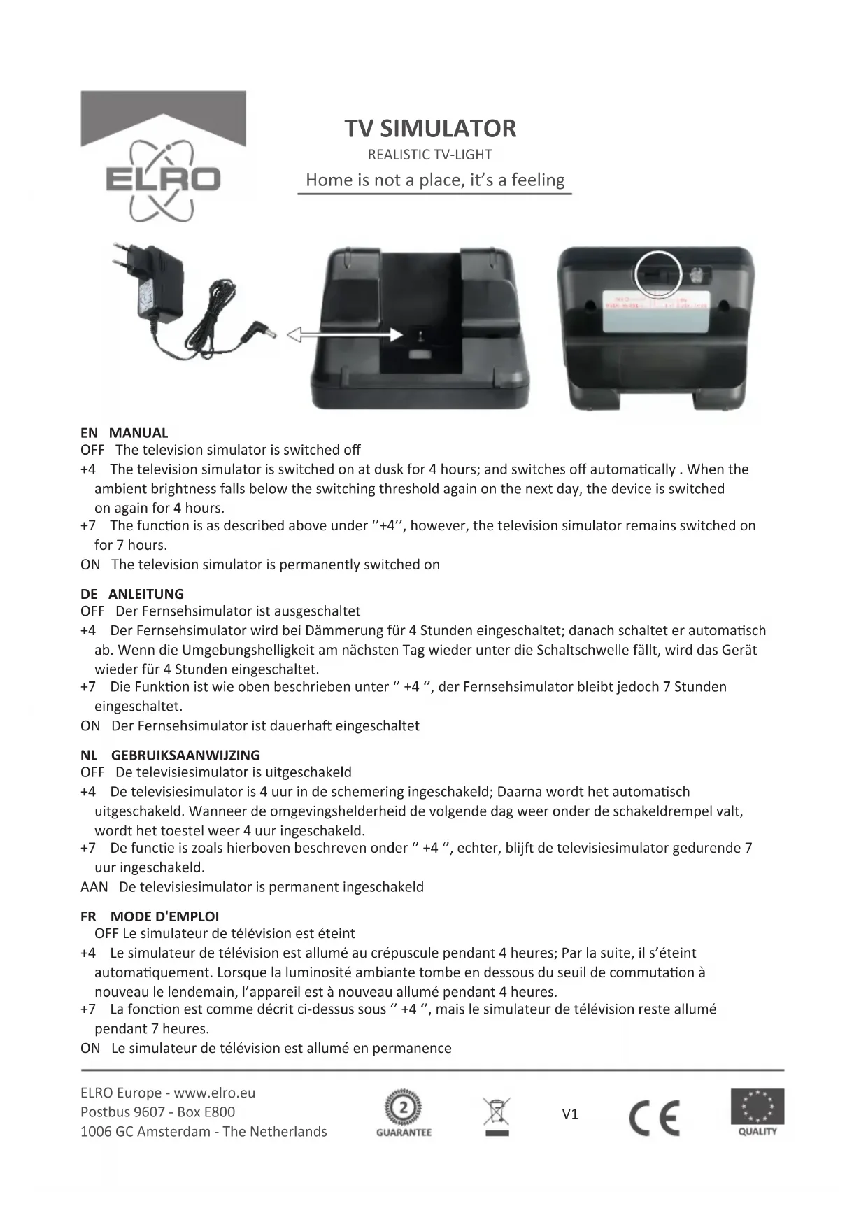 OFF Le simulateur de télévision est éteint +4 Le simulateur de télévision est allumé au crépuscule pendant 4 heures; Par la suite, il s’éteint automaquement. Lorsque la luminosité ambiante tombe en dessous du seuil de commutaon à nouveau le lendemain, l’appareil est à nouveau allumé pendant 4 heures. +7 La foncon est comme décrit ci-dessus sous ‘’ +4 ‘’, mais le simulateur de télévision reste allumé pendant 7 heures. ON Le simulateur de télévision est allumé en permanence ELRO Europe - www.elro.eu Postbus 9607 - Box E800 1006 GC Amsterdam - The Netherlands Home is not a place, it’s a feeling TV SIMULATOR REALISTIC TV-LIGHT