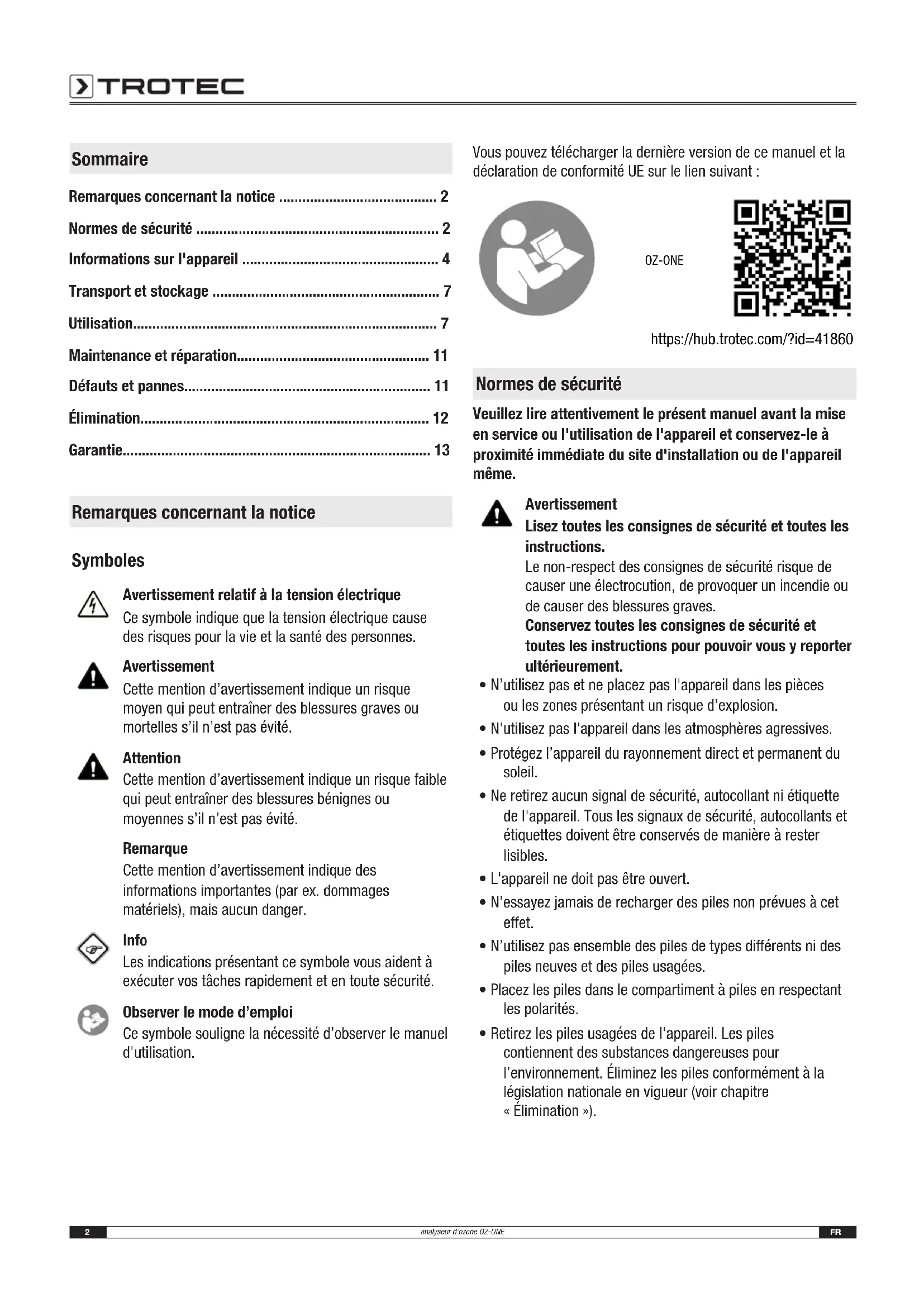- Garantie Remarques concernant la notice Symboles Avertissement relatif à la tension électrique Ce symbole indique que la tension électrique cause des risques pour la vie et la santé des personnes. Avertissement Cette mention d’avertissement indique un risque moyen qui peut entraîner des blessures graves ou mortelles s’il n’est pas évité. Attention Cette mention d’avertissement indique un risque faible qui peut entraîner des blessures bénignes ou moyennes s’il n’est pas évité. Remarque Cette mention d’avertissement indique des informations importantes (par ex. dommages matériels), mais aucun danger. Info Les indications présentant ce symbole vous aident à exécuter vos tâches rapidement et en toute sécurité. Observer le mode d’emploi Ce symbole souligne la nécessité d’observer le manuel d'utilisation. Vous pouvez télécharger la dernière version de ce manuel et la déclaration de conformitéUE sur le lien suivant: OZ-ONE https://hub.trotec.com/?id=41860 Normes de sécurité Veuillez lire attentivement le présent manuel avant la mise en service ou l'utilisation de l'appareil et conservez-le à proximité immédiate du site d'installation ou de l'appareil même. Avertissement Lisez toutes les consignes de sécurité et toutes les instructions. Le non-respect des consignes de sécurité risque de causer une électrocution, de provoquer un incendie ou de causer des blessures graves. Conservez toutes les consignes de sécurité et toutes les instructions pour pouvoir vous y reporter ultérieurement. p. 13