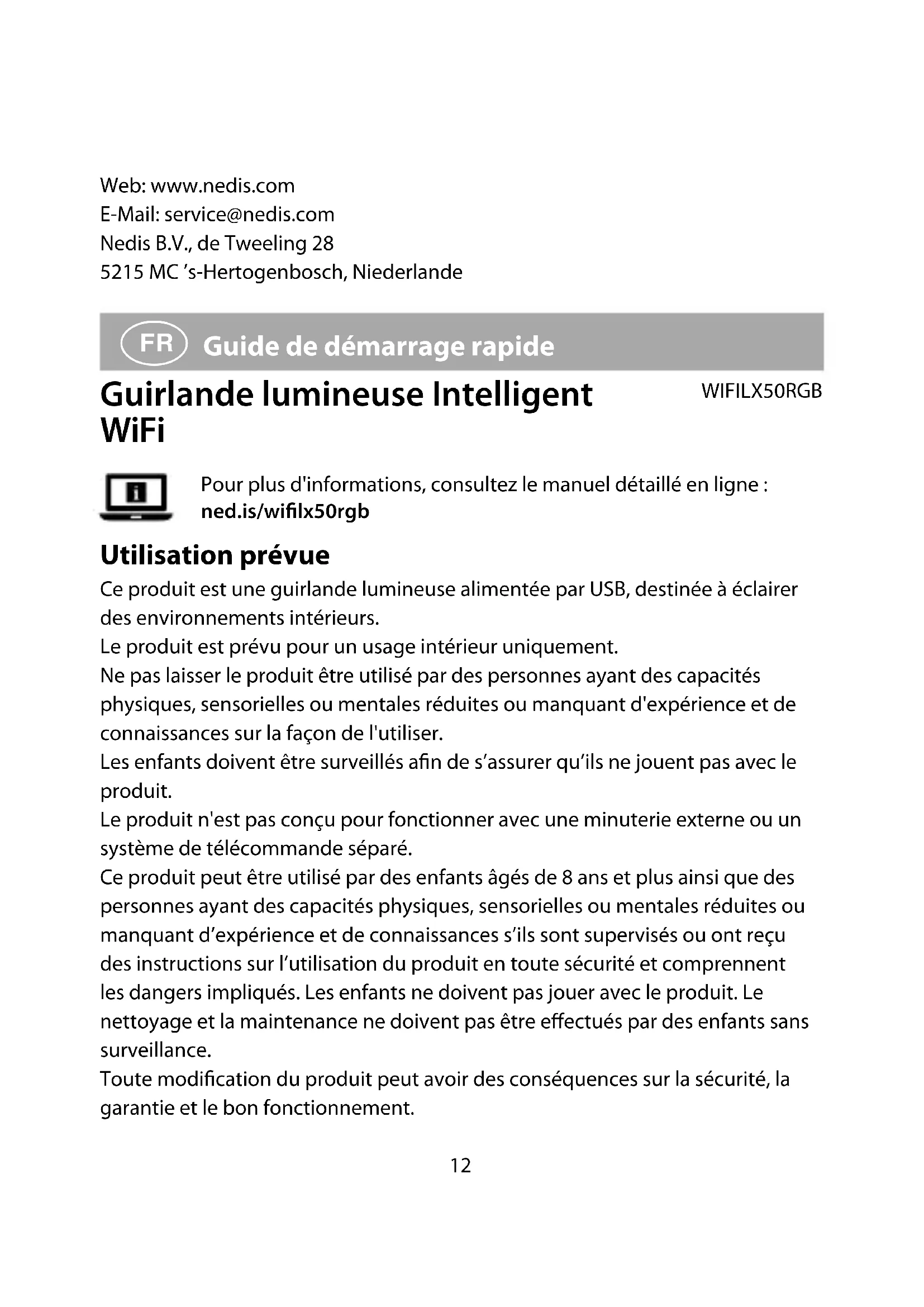 Guide de démarrage rapide Guirlande lumineuse Intelligent WiFi WIFILX50RGB Pour plus d'informations, consultez le manuel détaillé en ligne : ned.is/wilx50rgb Utilisation prévue Ce produit est une guirlande lumineuse alimentée par USB, destinée à éclairer des environnements intérieurs. Le produit est prévu pour un usage intérieur uniquement. Ne pas laisser le produit être utilisé par des personnes ayant des capacités physiques, sensorielles ou mentales réduites ou manquant d'expérience et de connaissances sur la façon de l'utiliser. Les enfants doivent être surveillés an de s’assurer qu’ils ne jouent pas avec le produit. Le produit n'est pas conçu pour fonctionner avec une minuterie externe ou un système de télécommande séparé. Ce produit peut être utilisé par des enfants âgés de 8 ans et plus ainsi que des personnes ayant des capacités physiques, sensorielles ou mentales réduites ou manquant d’expérience et de connaissances s’ils sont supervisés ou ont reçu des instructions sur l’utilisation du produit en toute sécurité et comprennent les dangers impliqués. Les enfants ne doivent pas jouer avec le produit. Le nettoyage et la maintenance ne doivent pas être eectués par des enfants sans surveillance. Toute modication du produit peut avoir des conséquences sur la sécurité, la garantie et le bon fonctionnement.13 Spécications Produit Guirlande lumineuse Intelligent WiFi Article numéro WIFILX50RGB Dimensions du contrôleur (L x l x h) 60 x 33 x 16 mm Alimentation électrique 5,0 VDC ; 1 A Gamme de fréquences FM 2412 - 2472 MHz Puissance de transmission maximale 16 dBm Poids 145g Longueur de câble 100 cm Longueur de la guirlande lumineuse 500 cm Pièces principales (image A) 1 Câble d'alimentation USB 2 Bouton d’alimentation 3 Bouton de couleur 4 Bouton musique 5 Microphone 6 Unité de contrôle 7 Bande LED Consignes de sécurité Ne pas utiliser le produit dans des endroits où il pourrait y avoir des éclaboussures d’eau, telles que des salles de bains, des piscines ou à proximité d’un lavabo.