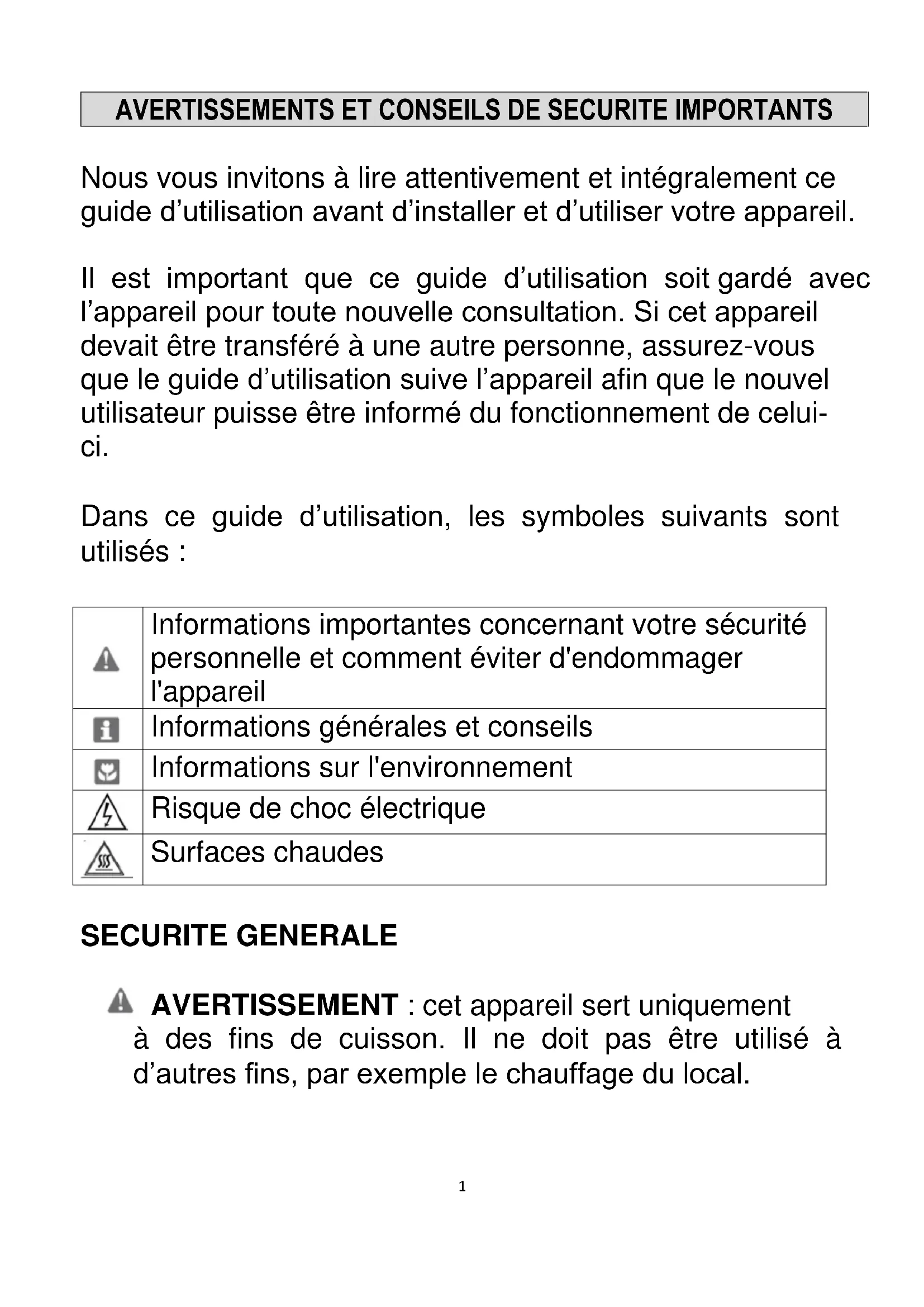 Nous vous invitons à lire attentivement et intégralement ce guide d’utilisation avant d’installer et d’utiliser votre appareil. Il est important que ce guide d’utilisation soit gardé avec l’appareil pour toute nouvelle consultation. Si cet appareil devait être transféré à une autre personne, assurez-vous que le guide d’utilisation suive l’appareil afin que le nouvel utilisateur puisse être informé du fonctionnement de celui- ci. Dans ce guide d’utilisation, les symboles suivants sont utilisés :