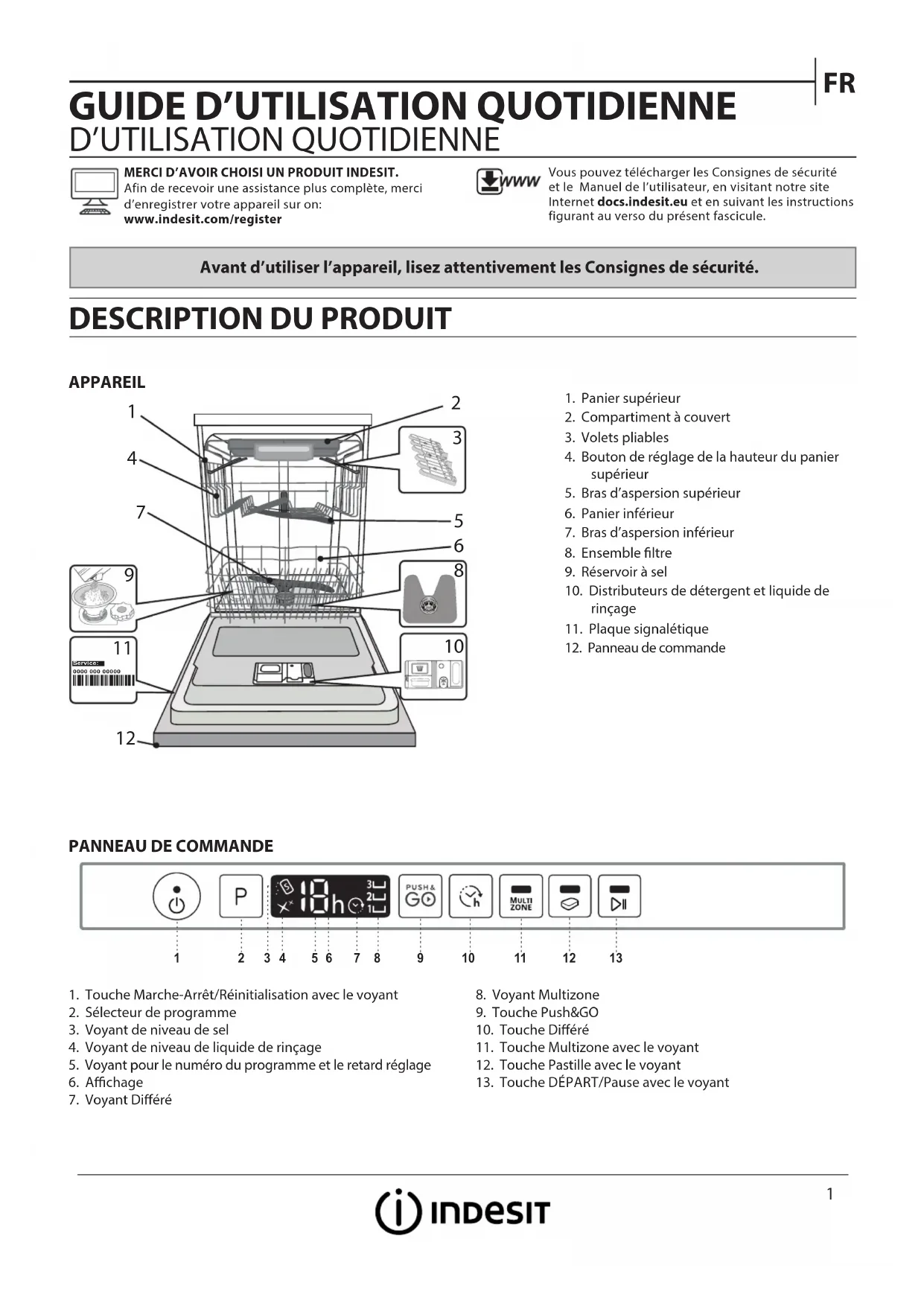 APPAREILPANNEAU DE COMMANDEMERCI D’AVOIR CHOISI UN PRODUIT INDESIT. Afin de recevoir une assistance plus complète, merci d’enregistrer votre appareil sur on: www.indesit.com/registerVous pouvez télécharger les Consignes de sécurité et le Manuel de l’utilisateur, en visitant notre site Internet docs.indesit.eu et en suivant les instructions figurant au verso du présent fascicule.1. Panier supérieur2. Compartiment à couvert3. Volets pliables4. Bouton de réglage de la hauteur du panier supérieur5. Bras d’aspersion supérieur6. Panier inférieur7. Bras d’aspersion inférieur8. Ensemble ltre9. Réservoir à sel10. Distributeurs de détergent et liquide de rinçage11. Plaque signalétique12. Panneau de commande1. Touche Marche-Arrêt/Réinitialisation avec le voyant2. Sélecteur de programme3. Voyant de niveau de sel4. Voyant de niveau de liquide de rinçage5. Voyant pour le numéro du programme et le retard réglage6. Achage7. Voyant Diéré8. Voyant Multizone9. Touche Push&GO10. Touche Diéré11. Touche Multizone avec le voyant12. Touche Pastille avec le voyant13. Touche DÉPART/Pause avec le voyant