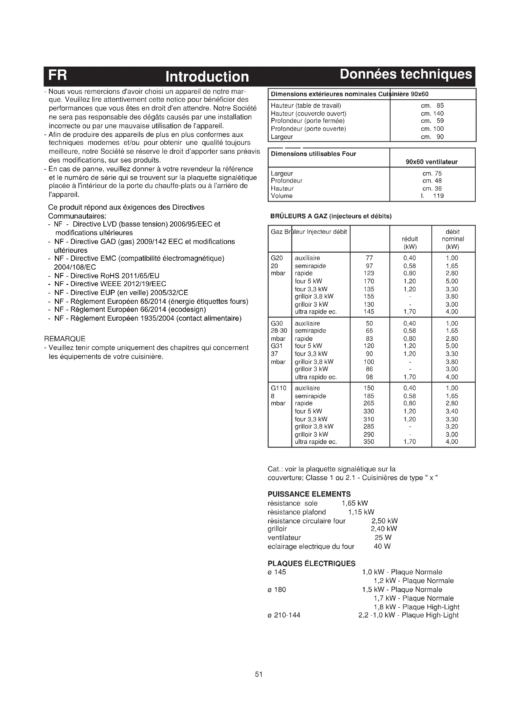 1,70 1,00 1,65 2,80 3,40 3,30 3,20 3,00 4,00 BRÛLEURS A GAZ (injecteurs et débits) Cat.: voir la plaquette signalétique sur la couverture; Classe 1 ou 2.1 - Cuisinières de type " x " PUISSANCE ELEMENTS rèsistance sole 1,65 kW rèsistance plafond 1,15 kW rèsistance circulaire four 2,50 kW grilloir 2,40 kW ventilateur 25 W eclairage electrique du four 40 W PLAQUES ÉLECTRIQUES ø 145 1,0 kW - Plaque Normale 1,2 kW - Plaque Normale ø 180 1,5 kW - Plaque Normale 1,7 kW - Plaque Normale 1,8 kW - Plaque High-Light ø 210-144 2,2 -1,0 kW - Plaque High-Light Données techniques Ce produit répond aux éxigences des Directives Communautaires: - NF - Directive LVD (basse tension) 2006/95/EEC et modifications ultérieures - NF - Directive GAD (gas) 2009/142 EEC et modifications ultérieures - NF - Directive EMC (compatibilité électromagnétique) 2004/108/EC - NF - Directive RoHS 2011/65/EU - NF - Directive WEEE 2012/19/EEC - NF - Directive EUP (en veille) 2005/32/CE - NF - Règlement Européen 65/2014 (énergie étiquettes fours) - NF - Règlement Européen 66/2014 (ecodesign) - NF - Règlement Européen 1935/2004 (contact alimentaire)52 EQUIPEMENT Tous les modèles sont équipés de dispositifs de sécurité pour les brûleurs du four et du grilloir. Suivant les modèles, les cuisinières peuvent avoir en plus: - Dispositif de sécurité sur un ou plusieurs brûleurs de la table de cuisson - Allumage électrique des brûleurs supérieurs - Allumage électrique des brûleurs du four et du grilloir - Thermostat pour four - Eclairage électrique du four - Tournebroche - Brûleur grilloir - Minuterie mécanique - Programmateur électronique Pour la DISPOSITION DES BRÛLEURS voir figure 1 à la fin de la notice. Pour le SCHEMA DES BRANCHEMENTS voir la figure 2 à la fin de la notice. La puissance électrique est indiquée sur la plaquette signaléti- que placée à l'intérieur de la porte du chauffe-plats ou à l'arrière de l'appareil. Informations utiles pour la consommation énergétique des fours électriques. Ces informations complètent celles de la fiche technique (auto- collant) et du manuel d’instructions. Cuisinière 96 N Multifunction Marque UE de qualité écologique Non Temps de cuisson chargement normal four statique en minutes. 61,6 Temps de cuisson chargement normal four ventilé en minutes 81,6 Consommation position stand-by en watts.