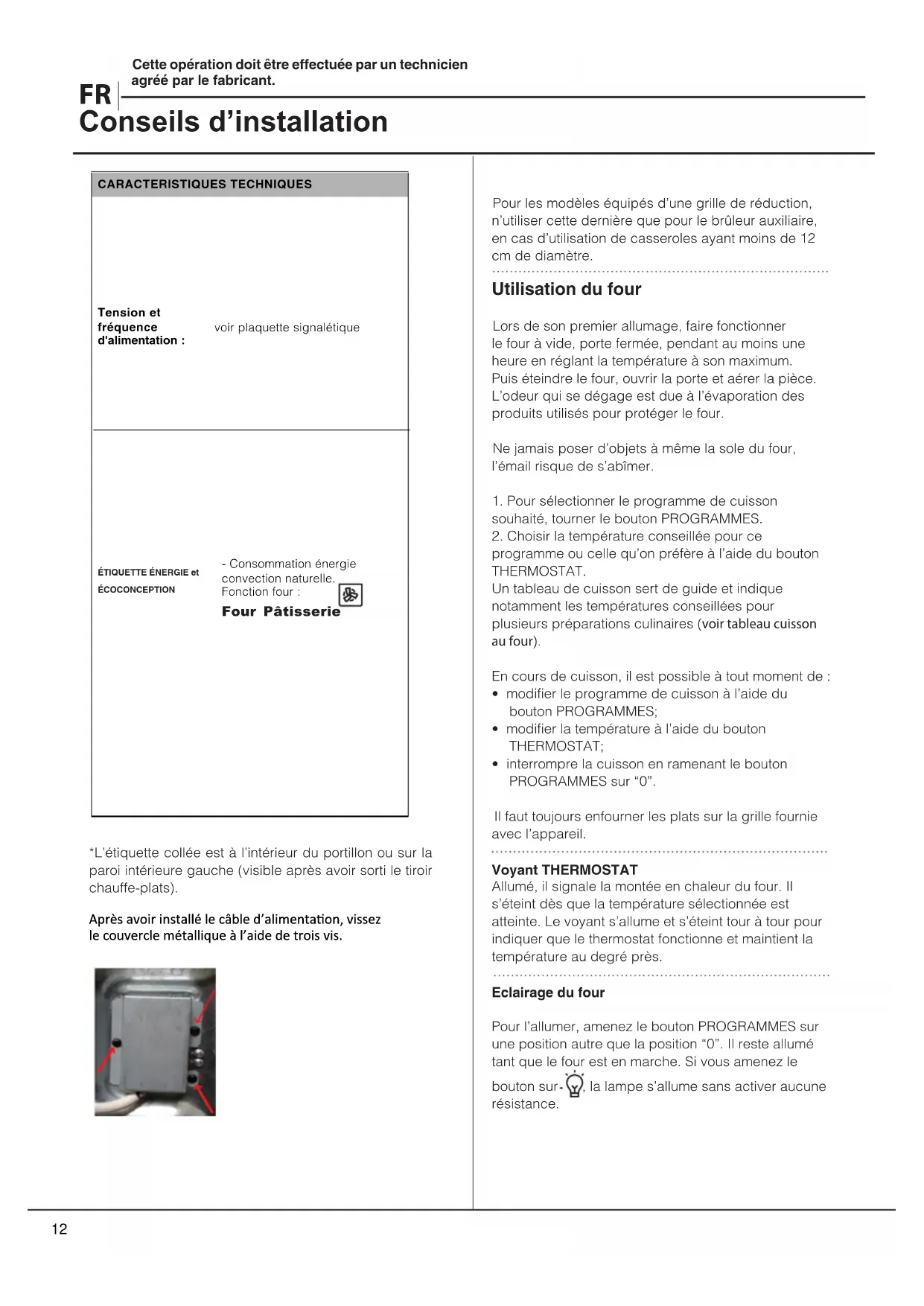 11Pour les modèles équipés d’une grille de réduction, n’utiliser cette dernière que pour le brûleur auxiliaire, en cas d’utilisation de casseroles ayant moins de 12 cm de diamètre. Utilisation du four Lors de son premier allumage, faire fonctionner le four à vide, porte fermée, pendant au moins une heure en réglant la température à son maximum. Puis éteindre le four, ouvrir la porte et aérer la pièce. L’odeur qui se dégage est due à l’évaporation des produits utilisés pour protéger le four. Ne jamais poser d’objets à même la sole du four, l’émail risque de s’abîmer.1. Pour sélectionner le programme de cuisson souhaité, tourner le bouton PROGRAMMES.2. Choisir la température conseillée pour ce programme ou celle qu’on préfère à l’aide du bouton THERMOSTAT. Un tableau de cuisson sert de guide et indique notamment les températures conseillées pour plusieurs préparations culinaires (voir tableau cuisson au four).En cours de cuisson, il est possible à tout moment de :• modifier le programme de cuisson à l’aide du bouton PROGRAMMES;• modifier la température à l’aide du bouton THERMOSTAT;• interrompre la cuisson en ramenant le bouton PROGRAMMES sur “0”. Il faut toujours enfourner les plats sur la grille fournie avec l’appareil.Voyant THERMOSTATAllumé, il signale la montée en chaleur du four. Il s’éteint dès que la température sélectionnée est atteinte. Le voyant s’allume et s’éteint tour à tour pour indiquer que le thermostat fonctionne et maintient la température au degré près.Eclairage du fourPour l’allumer, amenez le bouton PROGRAMMES sur une position autre que la position “0”. Il reste allumé tant que le four est en marche. Si vous amenez le bouton sur , la lampe s’allume sans activer aucune résistance.*L’étiquette collée est à l’intérieur du portillon ou sur la paroi intérieure gauche (visible après avoir sorti le tiroir chauffe-plats). Après avoir installé le câble d’alimentation, vissez le couvercle métallique à l’aide de trois vis. Après avoir installé le câble d’alimentation, vissez le couvercle métallique à l’aide de trois vis. Après avoir installé le câble d’alimentation, vissez le couvercle métallique à l’aide de trois vis. CARACTERISTIQUES TECHNIQUESTension etfréquenced'alimentation :voir plaquette signalétique- Consommation énergieconvection naturelle.Fonction four :ÉTIQUETTE ÉNERGIE et ÉCOCONCEPTIONFour Pâtisserie Conseils d’installation Cette opération doit être effectuée par un technicien agréé par le fabricant.