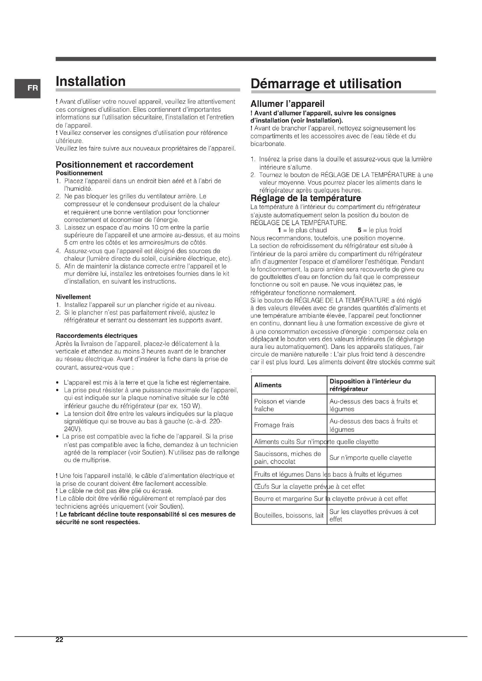 Installation ! Avant d’utiliser votre nouvel appareil, veuillez lire attentivement ces consignes d’utilisation. Elles contiennent d’importantes informations sur l’utilisation sécuritaire, l’installation et l’entretien de l’appareil. ! Veuillez conserver les consignes d’utilisation pour référence ultérieure. Veuillez les faire suivre aux nouveaux propriétaires de l’appareil. Positionnement et raccordement Positionnement