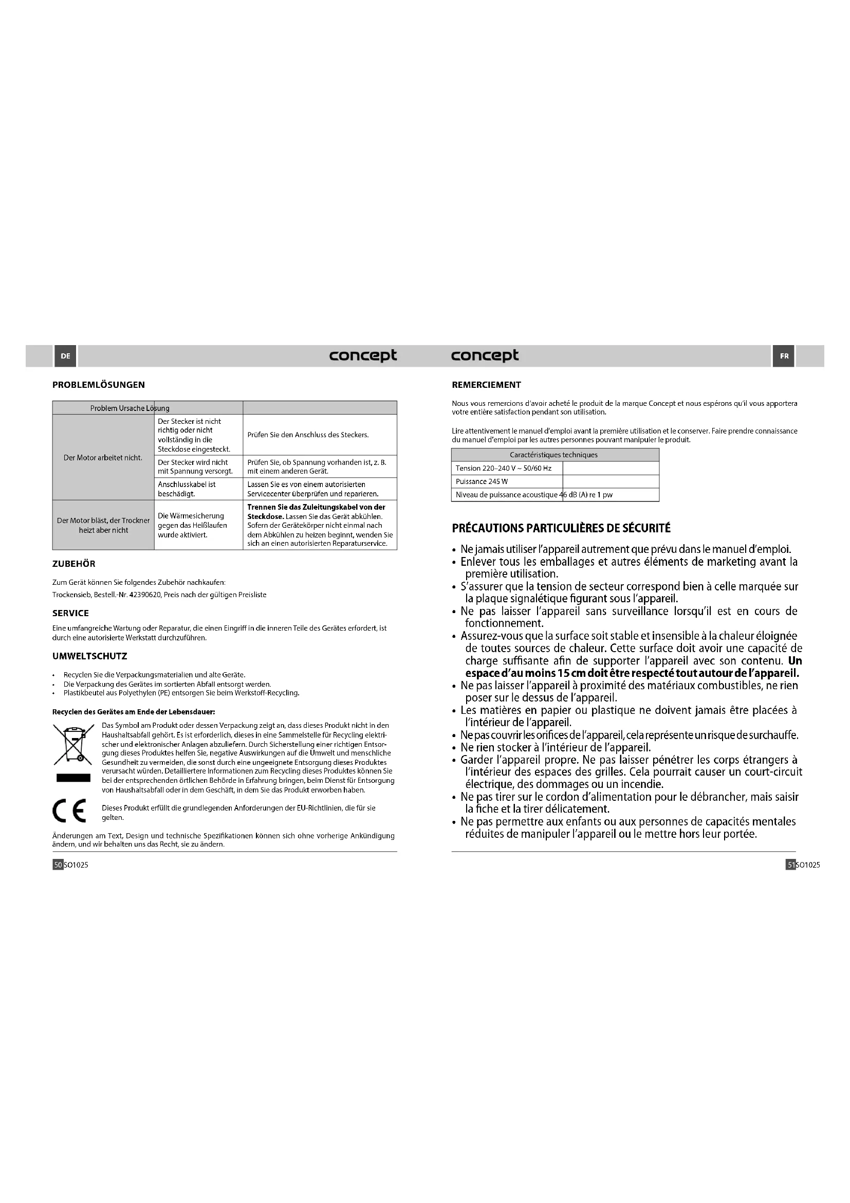 SO 1025 REMERCIEMENT Nous vous remercions d’avoir acheté le produit de la marque Concept et nous espérons qu’il vous apportera votre entière satisfaction pendant son utilisation. Lire attentivement le manuel d’emploi avant la première utilisation et le conserver. Faire prendre connaissance du manuel d’emploi par les autres personnes pouvant manipuler le produit. Caractéristiques techniques Tension 220–240 V ~ 50/60 Hz Puissance 245 W Niveau de puissance acoustique 46 dB (A) re 1 pw PRÉCAUTIONS PARTICULIÈRES DE SÉCURITÉ