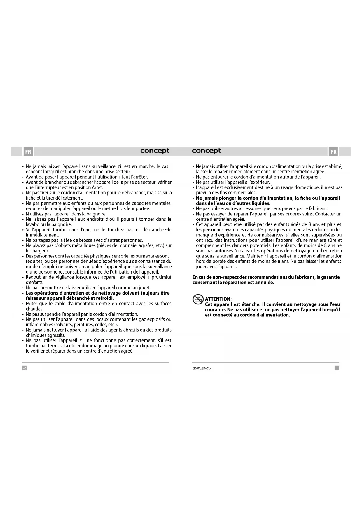 - Cet appareil peut être utilisé par des enfants âgés de 8 ans et plus et les personnes ayant des capacités physiques ou mentales réduites ou le manque d’expérience et de connaissances, si elles sont supervisées ou ont reçu des instructions pour utiliser l’appareil d’une manière sûre et comprennent les dangers potentiels. Les enfants de moins de 8 ans ne sont pas autorisés à réaliser les opérations de nettoyage ou d’entretien que sous la surveillance. Maintenir l’appareil et le cordon d’alimentation hors de portée des enfants de moins de 8 ans. Ne pas laisser les enfants jouer avec l’appareil. En cas de non-respect des recommandations du fabricant, la garantie concernant la réparation est annulée. ATTENTION : Cet appareil est étanche. Il convient au nettoyage sous l'eau courante. Ne pas utiliser et ne pas nettoyer l'appareil lorsqu'il est connecté au cordon d'alimentation.48 49 FRFR ZK401xZK401x