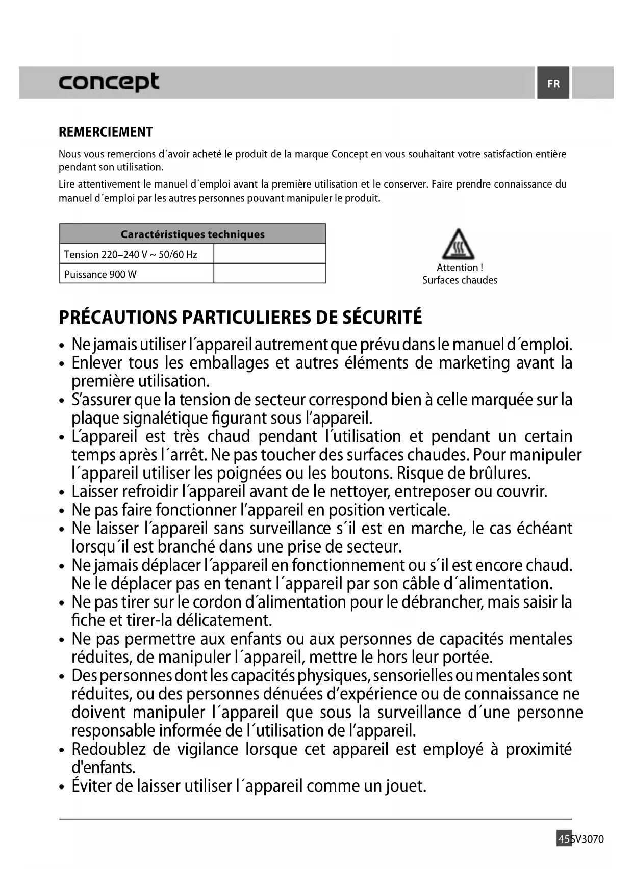 - Les sachets en plastique (PE) sont à remettre dans le centre de collecte sélective pour recyclage. Recyclage de l´appareil à la fin de vie : Le symbole apposé sur le produit ou son emballage indique que le produit ne doit pas être débarrassé avec les déchets municipaux. Il est nécessaire de remettre dans le centre de collecte pour recyclage d´équipements électriques et électroniques. En assurant une liquidation conforme de ce produit vous pouvez empêcher tout impacte négatif sur l´environnement et sur la santé humaine résultant de la liquidation non conforme de ce produit. De plus amples informations concernant le recyclage peuvent être obtenues auprès l´administration locale, le service de déchet ménager ou dans le magasin où vous avez acheté le produit. Le produit satisfait aux exigences élémentaires CE applicables. Le fabricant se réserve le droit d´effectuer les modifications du texte, design et spécifications techniques sans informations au préalable.IT 51S V3070 RINGRAZIAMENTO Grazie per aver acquisito il prodotto di marchio Concept. Vi auguriamo che vi dia la massima soddisfazione per tutta la durata della sua vita utile. Si consiglia di leggere attentamente l’intero manuale d’uso prima di procedere al primo uso dell’apparecchio. Conservare bene il manuale d’uso. Provvedere che tutte le persone addette all’uso del prodotto facciano la conoscenza del manuale d’uso. Parametri tecnici Tensione 220–240 V ~ 50/60 Hz Příkon 900 W