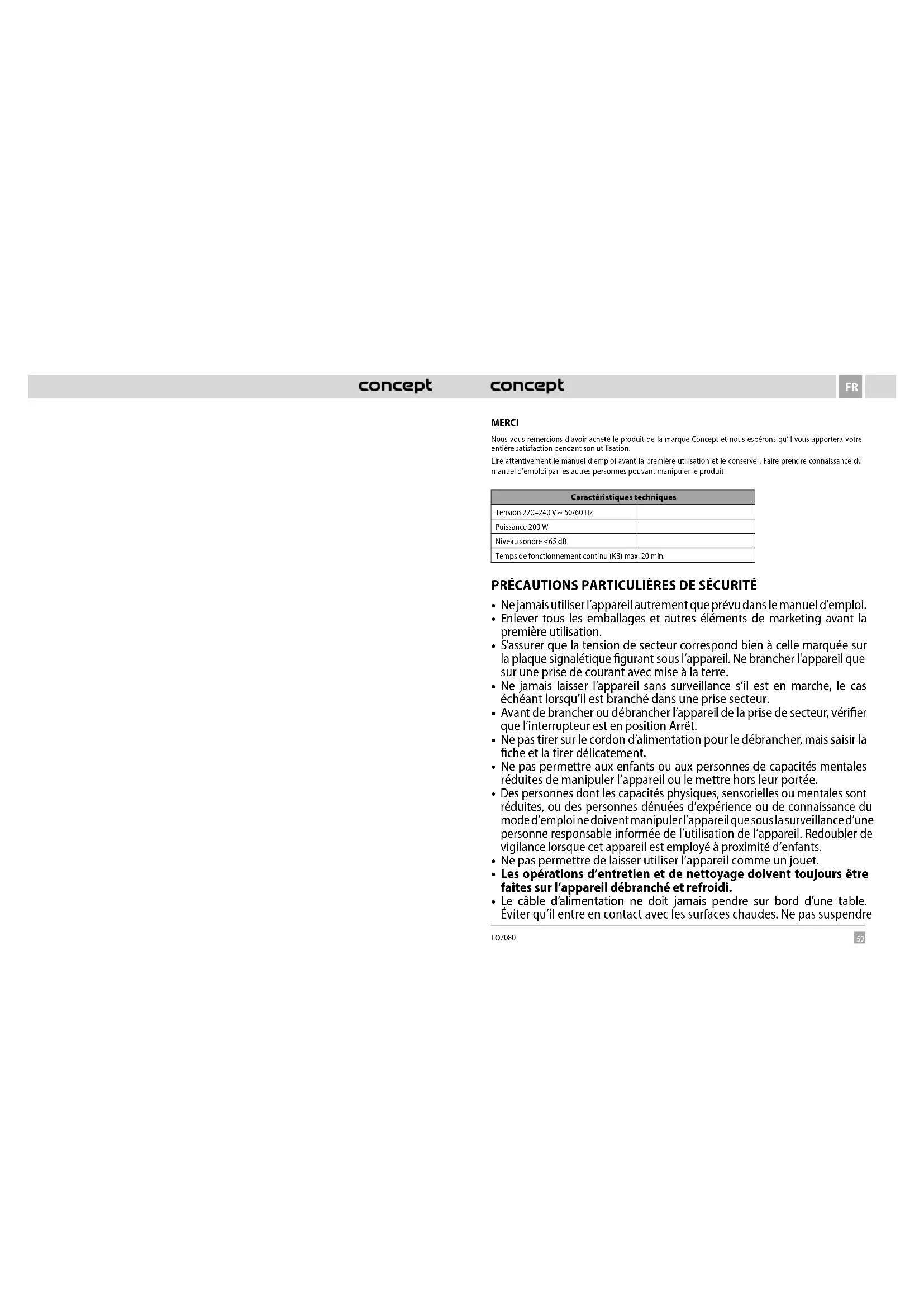 LO7080 MERCI Nous vous remercions d’avoir acheté le produit de la marque Concept et nous espérons qu’il vous apportera votre entière satisfaction pendant son utilisation. Lire attentivement le manuel d’emploi avant la première utilisation et le conserver. Faire prendre connaissance du manuel d’emploi par les autres personnes pouvant manipuler le produit. Caractéristiques techniques Tension 220–240 V ~ 50/60 Hz Puissance 200 W Niveau sonore ≤65 dB Temps de fonctionnement continu (KB) max. 20 min. PRÉCAUTIONS PARTICULIÈRES DE SÉCURITÉ