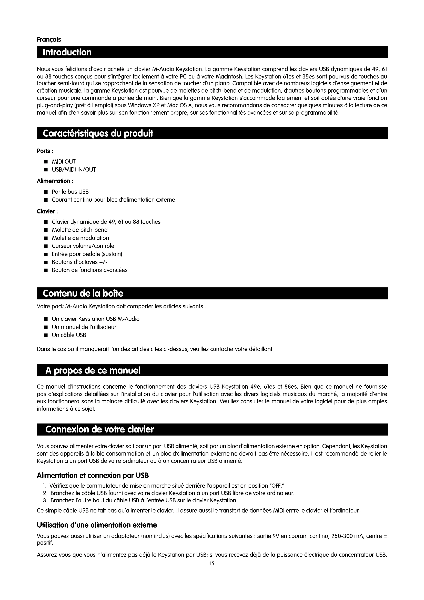 Alimentation : < Par le bus USB < Courant continu pour bloc d’alimentation externe Clavier : < Clavier dynamique de 49, 61 ou 88 touches < Molette de pitch-bend < Molette de modulation < Curseur volume/contrôle < Entrée pour pédale (sustain) < Boutons d’octaves +/- < Bouton de fonctions avancées Contenu de la boîte Votre pack M-Audio Keystation doit comporter les articles suivants : < Un clavier Keystation USB M-Audio < Un manuel de l’utilisateur < Un câble USB Dans le cas où il manquerait l’un des articles cités ci-dessus, veuillez contacter votre détaillant. A propos de ce manuel Ce manuel d’instructions concerne le fonctionnement des claviers USB Keystation 49e, 61es et 88es. Bien que ce manuel ne fournisse pas d’explications détaillées sur l’installation du clavier pour l’utilisation avec les divers logiciels musicaux du marché, la majorité d’entre eux fonctionnera sans la moindre difficulté avec les claviers Keystation. Veuillez consulter le manuel de votre logiciel pour de plus amples informations à ce sujet. Connexion de votre clavier Vous pouvez alimenter votre clavier soit par un port USB alimenté, soit par un bloc d’alimentation externe en option. Cependant, les Keystation sont des appareils à faible consommation et un bloc d’alimentation externe ne devrait pas être nécessaire. Il est recommandé de relier le Keystation à un port USB de votre ordinateur ou à un concentrateur USB alimenté. Alimentation et connexion par USB