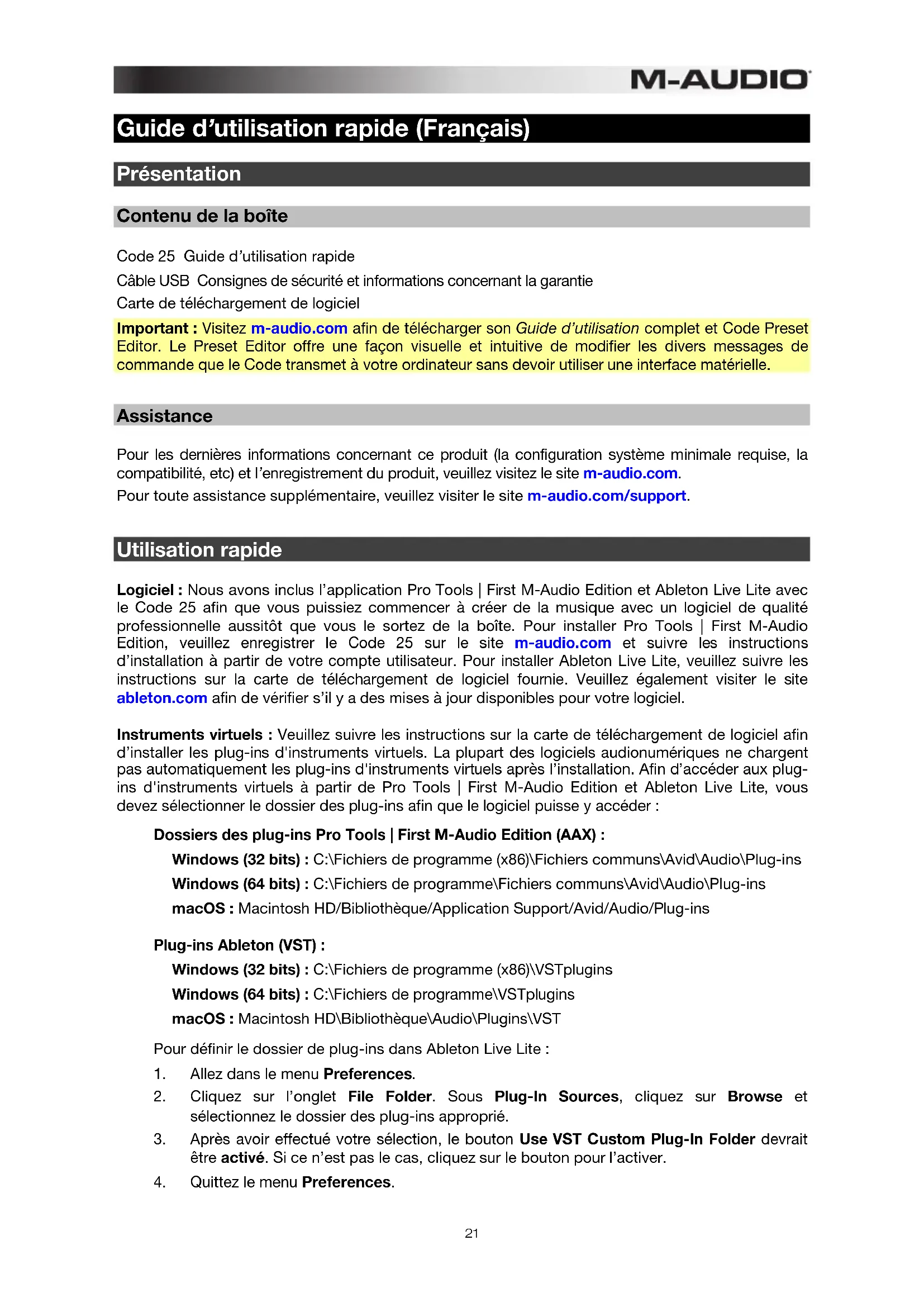 Guide d’utilisation rapide (Français) Présentation Contenu de la boîte Code 25 Guide d’utilisation rapide Câble USB Consignes de sécurité et informations concernant la garantie Carte de téléchargement de logiciel Important : Visitez m-audio.com afin de télécharger son Guide d’utilisation complet et Code Preset Editor. Le Preset Editor offre une façon visuelle et intuitive de modifier les divers messages de commande que le Code transmet à votre ordinateur sans devoir utiliser une interface matérielle. Assistance Pour les dernières informations concernant ce produit (la configuration système minimale requise, la compatibilité, etc) et l’enregistrement du produit, veuillez visitez le site m-audio.com. Pour toute assistance supplémentaire, veuillez visiter le site m-audio.com/support. Utilisation rapide Logiciel : Nous avons inclus l’application Pro Tools | First M-Audio Edition et Ableton Live Lite avec le Code 25 afin que vous puissiez commencer à créer de la musique avec un logiciel de qualité professionnelle aussitôt que vous le sortez de la boîte. Pour installer Pro Tools | First M-Audio Edition, veuillez enregistrer le Code 25 sur le site m-audio.com et suivre les instructions d’installation à partir de votre compte utilisateur. Pour installer Ableton Live Lite, veuillez suivre les instructions sur la carte de téléchargement de logiciel fournie. Veuillez également visiter le site ableton.com afin de vérifier s’il y a des mises à jour disponibles pour votre logiciel. Instruments virtuels : Veuillez suivre les instructions sur la carte de téléchargement de logiciel afin d’installer les plug-ins d'instruments virtuels. La plupart des logiciels audionumériques ne chargent pas automatiquement les plug-ins d'instruments virtuels après l’installation. Afin d’accéder aux plug- ins d'instruments virtuels à partir de Pro Tools | First M-Audio Edition et Ableton Live Lite, vous devez sélectionner le dossier des plug-ins afin que le logiciel puisse y accéder : Dossiers des plug-ins Pro Tools | First M-Audio Edition (AAX) : Windows (32 bits) : C:\Fichiers de programme (x86)\Fichiers communs\Avid\Audio\Plug-ins Windows (64 bits) : C:\Fichiers de programme\Fichiers communs\Avid\Audio\Plug-ins macOS : Macintosh HD/Bibliothèque/Application Support/Avid/Audio/Plug-ins Plug-ins Ableton (VST) : Windows (32 bits) : C:\Fichiers de programme (x86)\VSTplugins Windows (64 bits) : C:\Fichiers de programme\VSTplugins macOS : Macintosh HD\Bibliothèque\Audio\Plugins\VST Pour définir le dossier de plug-ins dans Ableton Live Lite :