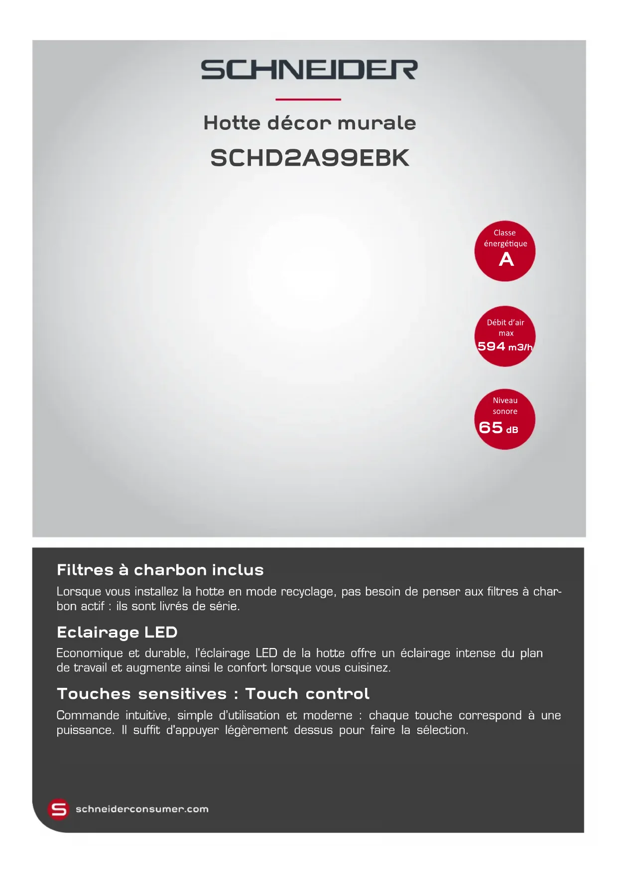 | Caractéristiques techniques | Hotte SCHNEIDER SCHD2A99EBK, type murale, extraction |