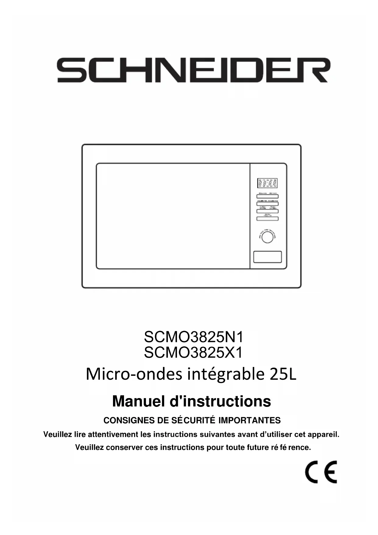 Modèle : SCMO3825N1 SCMO3825X1 Tension et fréquence nominales : 230 V~ 50 Hz Puissance d'entrée nominale (micro-ondes) : 1450 W Puissance de sortie nominale (micro-ondes) : 900 W Puissance d'entrée nominale (gril) : 1000 W Capacité du four : 25 L Diamètre du plateau tournant : Ø 315 mm Dimensions externes : 595 x 400 x 388 mm Poids net : 18,5 kgMISE AU REBUT Ce logo apposé sur le produit signifie qu’il s’agit d’un appareil dont le traitement en tant que déchet rentre dans le cadre de la directive 2012/19/UE du 4 juillet 2012, relative aux déchets d’équipements électriques et électroniques (DEEE). Cela signifie que ce produit doit être pris en charge par un système de collecte sélectif conformément à la directive européenne citée ci-dessus afin de pouvoir soit être recyclé soit démantelé afin de réduire tout impact sur l’environnement Les substances dangereuses contenues dans les équipements électriques et électroniques peuvent avoir des effets potentiellement dangereux pour l’environnement et la santé humaine. Ainsi, lors de la fin de vie de cet appareil, celui-ci ne doit pas être débarrassé avec les déchets municipaux non triés. Des systèmes de reprise et de collecte sont mis à votre disposition par les collectivités locales (déchetteries) et les distributeurs. Informations sur la signification du marquage de conformité Le marquage indique que le produit répond aux principales exigences des Directives Européenne : 2014/35/UE (Basse Tension), 2014/30/UE (Compatibilité Electromagnétique), 2011/65/UE (Limitation d'utilisation de certaines substances dans les équipements électroniques) 30GARANTIE La garantie ne couvre pas les pièces d’usure du produit, ni les problèmes ou les dommages résultant de: (1) détériorations superficielles dues à l'usure normale du produit ; (2) défauts ou détériorations dus au contact du produit avec des liquides et dus à la corrosion provoquée par la rouille ou de présence d'insectes; (3) tout incident, abus, utilisation impropre, modification, démontage ou réparation non autorisés; (4) toute opération impropre d'entretien, utilisation non conforme aux instructions concernant le produit ou le branchement à une tension incorrecte ; (5) toute utilisation d'accessoires non fournis ou non approuvés par le fabricant. La garantie sera annulée en cas d'élimination de la plaque signalétique et/ou du numéro de série du produit. 31Importé par : SCHNEIDER CONSUMER GROUP 12 rue Jules Ferry - 93110 Rosny-Sous-Bois, France