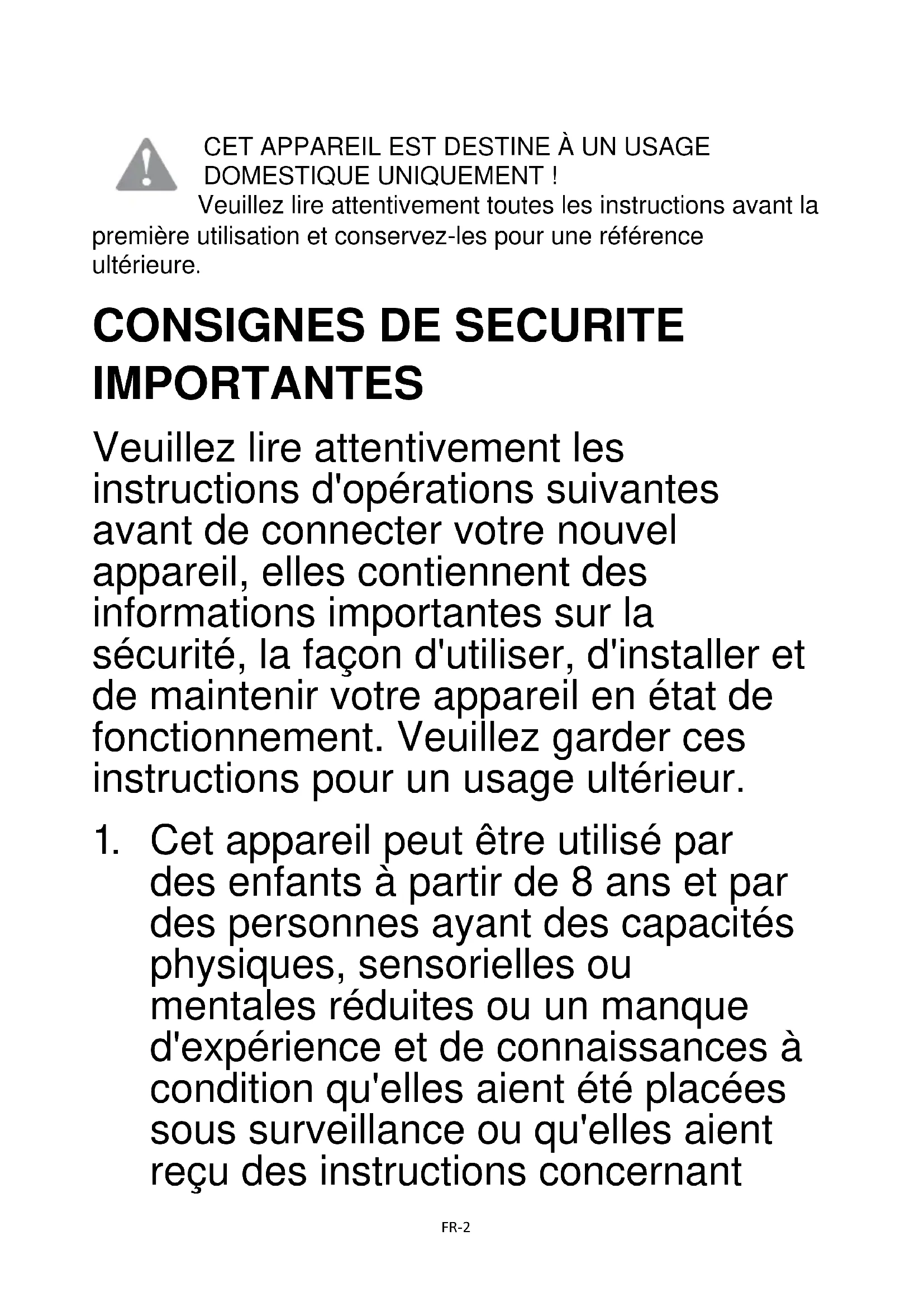 Cet appareil peut être utilisé par des enfants à partir de 8 ans et par des personnes ayant des capacités physiques, sensorielles ou mentales réduites ou un manque d'expérience et de connaissances à condition qu'elles aient été placées sous surveillance ou qu'elles aient reçu des instructions concernantFR-3 l'utilisation de l'appareil en toute sécurité et qu'elles comprennent les dangers encourus. Les enfants ne doivent pas jouer avec l'appareil. Le nettoyage et l'entretien par l'usager ne doivent pas être effectués par des enfants, sans surveillance.