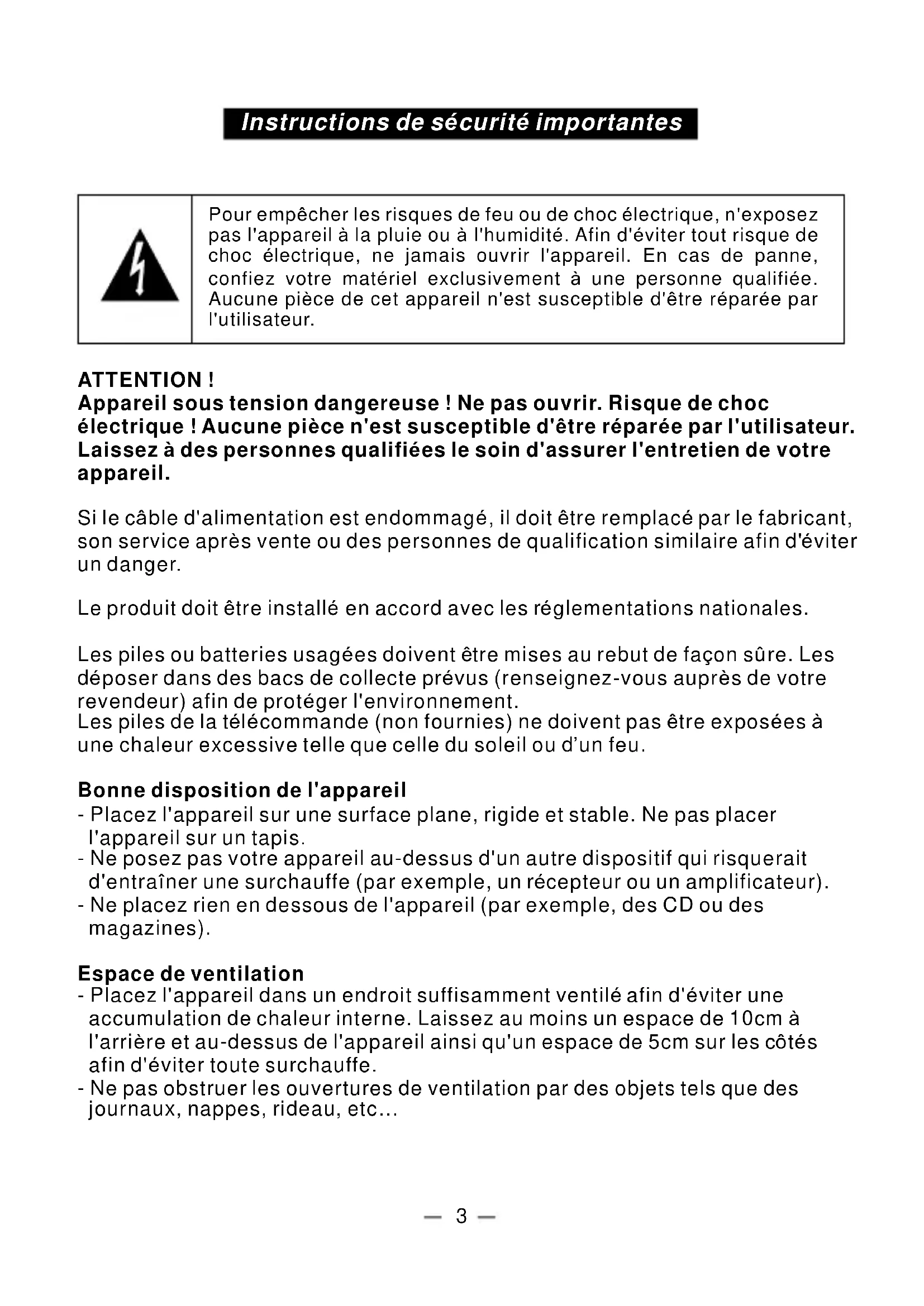 Getting Started Operations For ReferenceInstructions de sécurité importantes ATTENTION ! Appareil sous tension dangereuse ! Ne pas ouvrir. Risque de choc électrique ! Aucune pièce n'est susceptible d'être réparée par l'utilisateur. Laissez à des personnes qualifiées le soin d'assurer l'entretien de votre appareil. Si le câble d'alimentation est endommagé, il doit être remplacé par le fabricant, son service après vente ou des personnes de qualification similaire afin d'éviter un danger. Le produit doit être installé en accord avec les réglementations nationales. Les piles ou batteries usagées doivent être mises au rebut de façon sûre. Les déposer dans des bacs de collecte prévus (renseignez-vous auprès de votre revendeur) afin de protéger l'environnement. Les piles de la télécommande (non fournies) ne doivent pas être exposées à une chaleur excessive telle que celle du soleil ou d’un feu. Bonne disposition de l'appareil - Placez l'appareil sur une surface plane, rigide et stable. Ne pas placer l'appareil sur un tapis. - Ne posez pas votre appareil au-dessus d'un autre dispositif qui risquerait d'entraîner une surchauffe (par exemple, un récepteur ou un amplificateur). - Ne placez rien en dessous de l'appareil (par exemple, des CD ou des magazines). Espace de ventilation - Placez l'appareil dans un endroit suffisamment ventilé afin d'éviter une accumulation de chaleur interne. Laissez au moins un espace de 10cm à l'arrière et au-dessus de l'appareil ainsi qu'un espace de 5cm sur les côtés afin d'éviter toute surchauffe. - Ne pas obstruer les ouvertures de ventilation par des objets tels que des journaux, nappes, rideau, etc… Pour empêcher les risques de feu ou de choc électrique, n'exposez pas l'appareil à la pluie ou à l'humidité. Afin d'éviter tout risque de choc électrique, ne jamais ouvrir l'appareil. En cas de panne, confiez votre matériel exclusivement à une personne qualifiée. Aucune pièce de cet appareil n'est susceptible d'être réparée par l'utilisateur.
