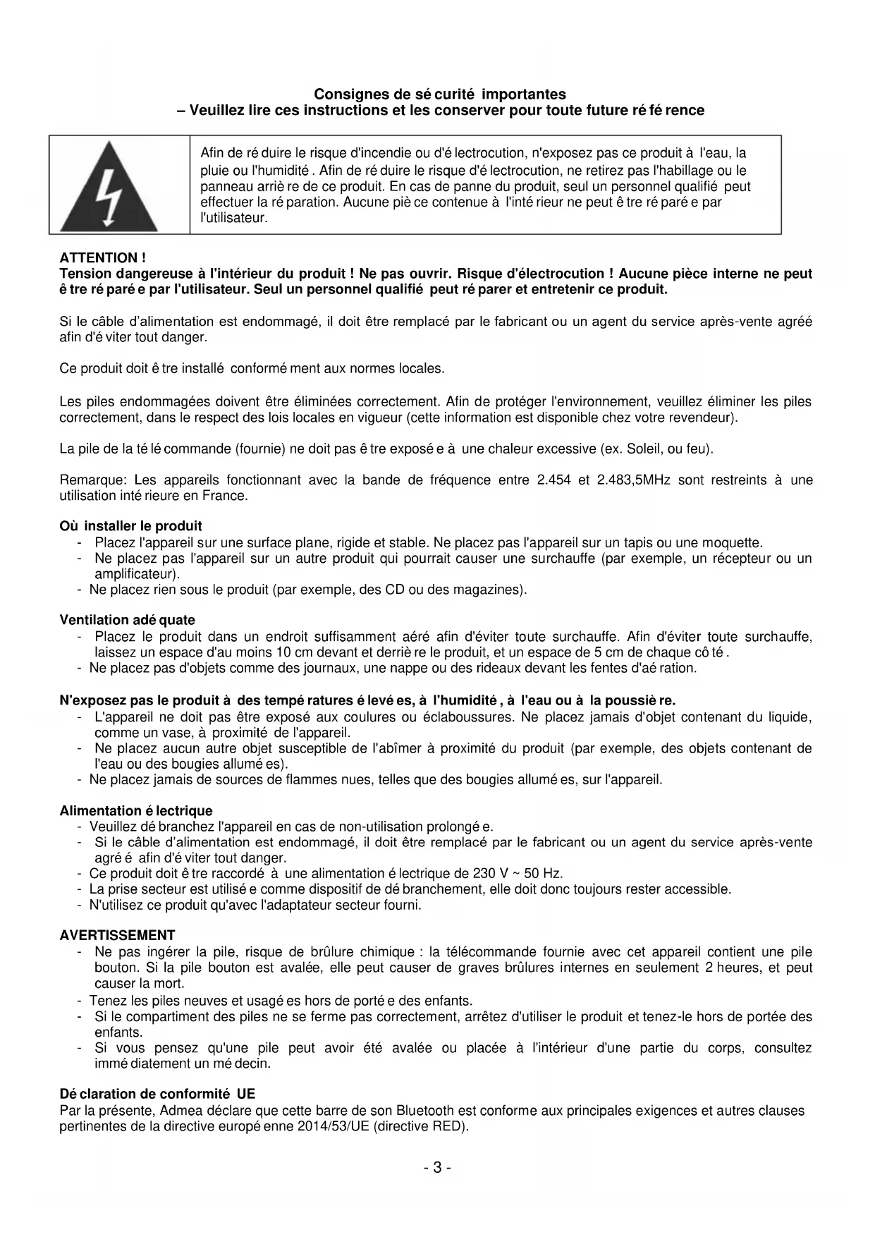ATTENTION ! Tension dangereuse à l'intérieur du produit ! Ne pas ouvrir. Risque d'électrocution ! Aucune pièce interne ne peut être réparée par l'utilisateur. Seul un personnel qualifié peut réparer et entretenir ce produit. Si le câble d’alimentation est endommagé, il doit être remplacé par le fabricant ou un agent du service après-vente agréé afin d'éviter tout danger. Ce produit doit être installé conformément aux normes locales. Les piles endommagées doivent être éliminées correctement. Afin de protéger l'environnement, veuillez éliminer les piles correctement, dans le respect des lois locales en vigueur (cette information est disponible chez votre revendeur). La pile de la télécommande (fournie) ne doit pas être exposée à une chaleur excessive (ex. Soleil, ou feu). Remarque: Les appareils fonctionnant avec la bande de fréquence entre 2.454 et 2.483,5MHz sont restreints à une utilisation intérieure en France. Où installer le produit - Placez l'appareil sur une surface plane, rigide et stable. Ne placez pas l'appareil sur un tapis ou une moquette. - Ne placez pas l'appareil sur un autre produit qui pourrait causer une surchauffe (par exemple, un récepteur ou un amplificateur). - Ne placez rien sous le produit (par exemple, des CD ou des magazines). Ventilation adéquate - Placez le produit dans un endroit suffisamment aéré afin d'éviter toute surchauffe. Afin d'éviter toute surchauffe, laissez un espace d'au moins 10 cm devant et derrière le produit, et un espace de 5 cm de chaque côté. - Ne placez pas d'objets comme des journaux, une nappe ou des rideaux devant les fentes d'aération. N'exposez pas le produit à des températures élevées, à l'humidité, à l'eau ou à la poussière. - L'appareil ne doit pas être exposé aux coulures ou éclaboussures. Ne placez jamais d'objet contenant du liquide, comme un vase, à proximité de l'appareil. - Ne placez aucun autre objet susceptible de l'abîmer à proximité du produit (par exemple, des objets contenant de l'eau ou des bougies allumées). - Ne placez jamais de sources de flammes nues, telles que des bougies allumées, sur l'appareil. Alimentation électrique - Veuillez débranchez l'appareil en cas de non-utilisation prolongée. - Si le câble d’alimentation est endommagé, il doit être remplacé par le fabricant ou un agent du service après-vente agréé afin d'éviter tout danger. - Ce produit doit être raccordé à une alimentation électrique de 230 V ~ 50 Hz. - La prise secteur est utilisée comme dispositif de débranchement, elle doit donc toujours rester accessible. - N'utilisez ce produit qu'avec l'adaptateur secteur fourni. AVERTISSEMENT - Ne pas ingérer la pile, risque de brûlure chimique : la télécommande fournie avec cet appareil contient une pile bouton. Si la pile bouton est avalée, elle peut causer de graves brûlures internes en seulement 2 heures, et peut causer la mort. - Tenez les piles neuves et usagées hors de portée des enfants. - Si le compartiment des piles ne se ferme pas correctement, arrêtez d'utiliser le produit et tenez-le hors de portée des enfants. - Si vous pensez qu'une pile peut avoir été avalée ou placée à l'intérieur d'une partie du corps, consultez immédiatement un médecin. Déclaration de conformité UE Par la présente, Admea déclare que cette barre de son Bluetooth est conforme aux principales exigences et autres clauses pertinentes de la directive européenne 2014/53/UE (directive RED).- 4 - Le texte intégral de cette déclaration de conformité est disponible à l'adresse internet suivante : http://www.schneiderconsumer.com