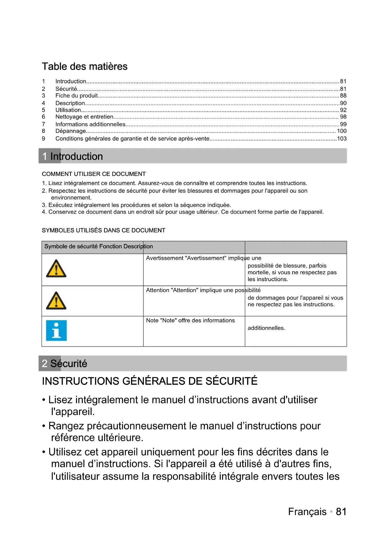 Symbole de sécurité Fonction Description Avertissement "Avertissement" implique une possibilité de blessure, parfois mortelle, si vous ne respectez pas les instructions. Attention "Attention" implique une possibilité de dommages pour l'appareil si vous ne respectez pas les instructions. Note "Note" offre des informations additionnelles. 2 Sécurité INSTRUCTIONS GÉNÉRALES DE SÉCURITÉ