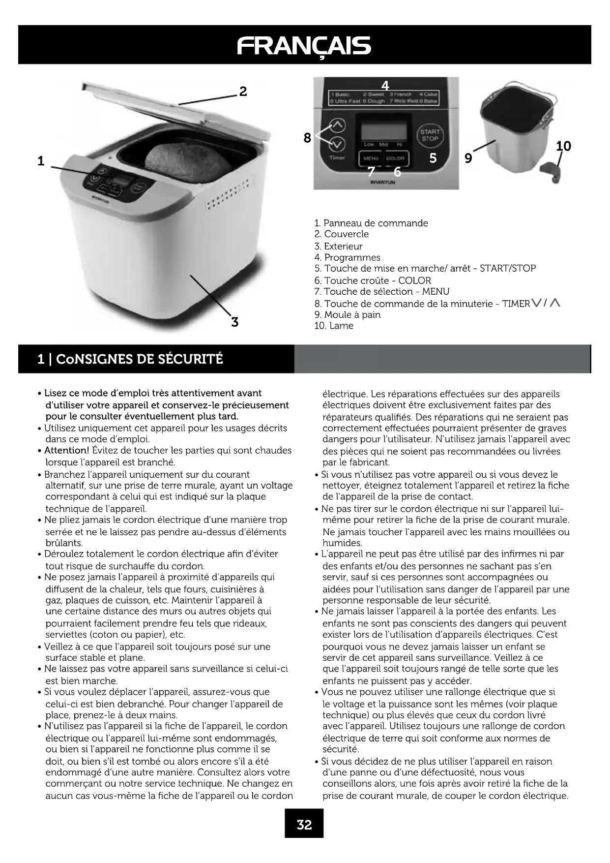 Le principal facteur pour réussir votre pain, c’est la qualité, la fraîcheur et le dosage correct de vos ingrédients. La farine La farine est l’élément de base du pain. Le poids de la farine dière selon le type de la farine. C’est pourquoi il est absolument nécessaire de doser la bonne quantité en vous servant d’une balance de cuisine. Attention: Ce necessaire que la farine est commode pour le machine du pain (la farine patent ce n’est pas possible). Le gluten Il y a du gluten dans la farine, et ce gluten permet au pain de mieux lever. La levure La levure est un micro-organisme qui pousse dans divers produits alimentaires végétaux. La levure a la propriété de transformer les sucres en alcool et en gaz carbonique, ce qui fait qu’elle se multiplie très vite. C’est donc le produit idéal pour faire lever la pâte et pour la rendre plus légère et plus facile à digérer. Dans la machine à pain Inventum, nous vous conseillons d’utiliser de la levure sèche. La levure sèche (en grains) est plus facile à travailler et se conserve plus longtemps que la levure fraîche. La levure sèche donne un résultat de cuisson plus constant que la levure fraîche. Le sel Le sel n’est pas seulement là pour donner du goût au pain, mais il règle aussi l’activité de la levure, il rend la pâte ferme et compacte et il évite que le pain ne lève trop vite. La qualité du pain que vous ferez dans la machine à pain va dépendre de plusieurs facteurs. Plus vous vous servirez de votre machine à pain, plus vite vous apprendrez à connaître ces facteurs et le résultat final n’en sera que meilleur. Tous les ingrédients doivent être à température ambiante. La machine à faire le pain est livrée avec une mesure et une cuillère de dosage. Faire du pain, c’est relativement simple, mais cela exige tout de même une précision extrême dans le dosage des ingrédients. La machine à faire le pain vous laisse le choix entre diérentes méthodes de travail. Choisissez le mode de cuisson qui convient au type de pain que vous désirez fabriquer, ou sinon tel que c’est indiqué dans la recette. Avant d’utiliser l’appareil pour la première fois, il faut procéder aux opérations suivantes: déballer l’appareil avec précaution et retirer tout le matériel d’emballage. Veiller à ce que le matériel d’emballage (sacs en plastique et carton) soit hors de portée des enfants. Après avoir retiré l’appareil de son emballage, contrôler minutieusement s’il n’y a pas de dommages visibles ayant peut être causés pendant le transport. Avant d’utiliser l’apareil, contrôlez s’il y a tous les accessoires (la machine du pain, le mode d’ emploi, le moule du pain et la lame petrissante) avec et s’ils ont tous été retirés de l’emballage. Retirez la feuille de cellophane qui est fixée sur le panneau de commande. Placez l’appareil sur une surface plane et stable. Nettoyez la machine du pain, le moule du pain et la lame petrissante avec un chion humide. Le moule de pain et la lame petrissante sont prévoir avec un anti-adhésif, n’utilisez jamais d’éponge à récurer ou un produit abrasif. Utilisez toujours un chion humide. Il se peut que votre machine à faire du pain fume un peu lors de la première utilisation. 2 | poUR LA pREMIèRE UTILISATIoN