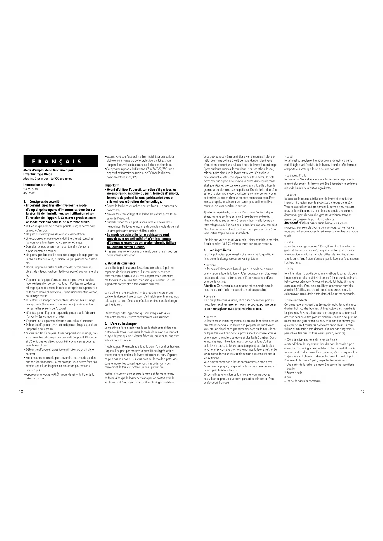 - Ordre à suivre pour remplir le moule à pain Ajoutez d’abord les ingrédients liquides dans le moule à pain et ensuite tous les ingrédients solides. La levure ne doit jamais venir en contact direct avec l’eau ou le sel, c’est pourquoi il faut toujours mettre la levure en dernier lieu dans le moule à pain. Pour remplir le moule à pain, respectez l’ordre suivant: 1.Une partie de la farine, de façon à recouvrir les ingrédients liquides 2.Beurre / huile 3.Eau 4.Les oeufs battus (si nécessaire) Mode d’emploi de la Machine à pain Inventum type BM65 Machine à pain pour de 900 grammes Information technique: 230V~50Hz 450 Watt