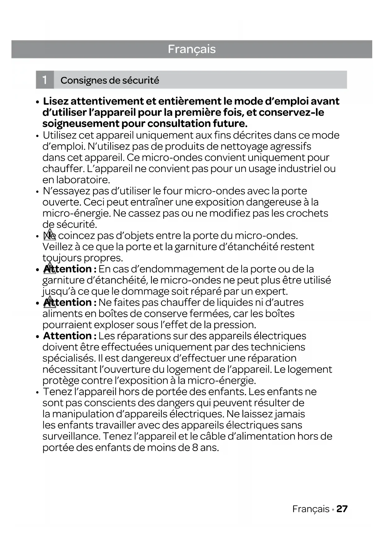 - Utilisez cet appareil uniquement aux fins décrites dans ce mode d'emploi. N'utilisez pas de produits de nettoyage agressifs dans cet appareil. Ce micro-ondes convient uniquement pour chauffer. L'appareil ne convient pas pour un usage industriel ou en laboratoire.