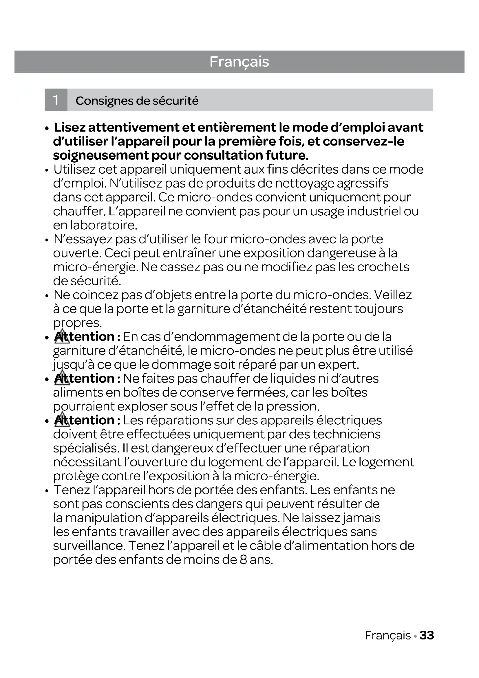 1. Consignes de sécurité page 33