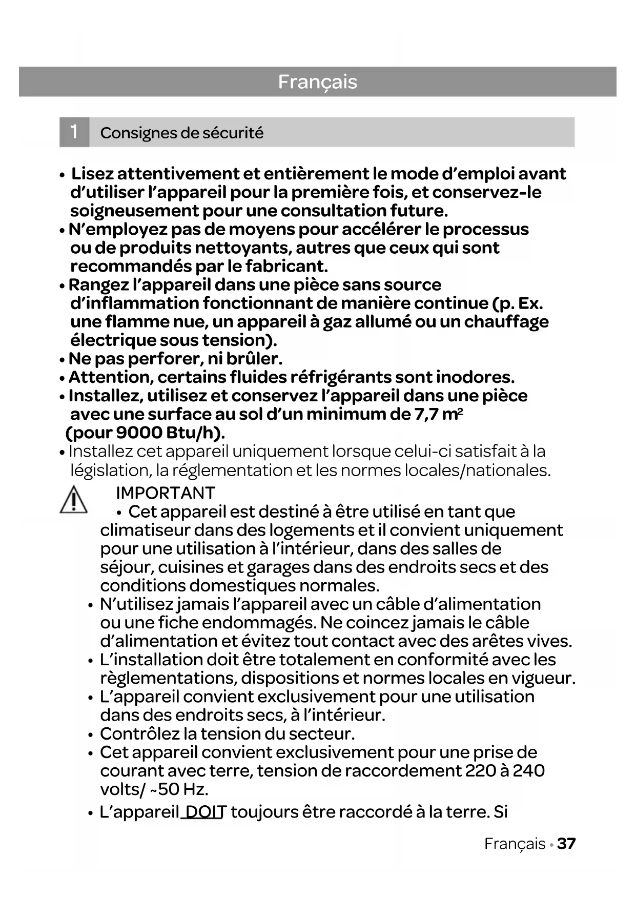 - Cet appareil est destiné à être utilisé en tant que climatiseur dans des logements et il convient uniquement pour une utilisation à l’intérieur, dans des salles de séjour, cuisines et garages dans des endroits secs et des conditions domestiques normales.