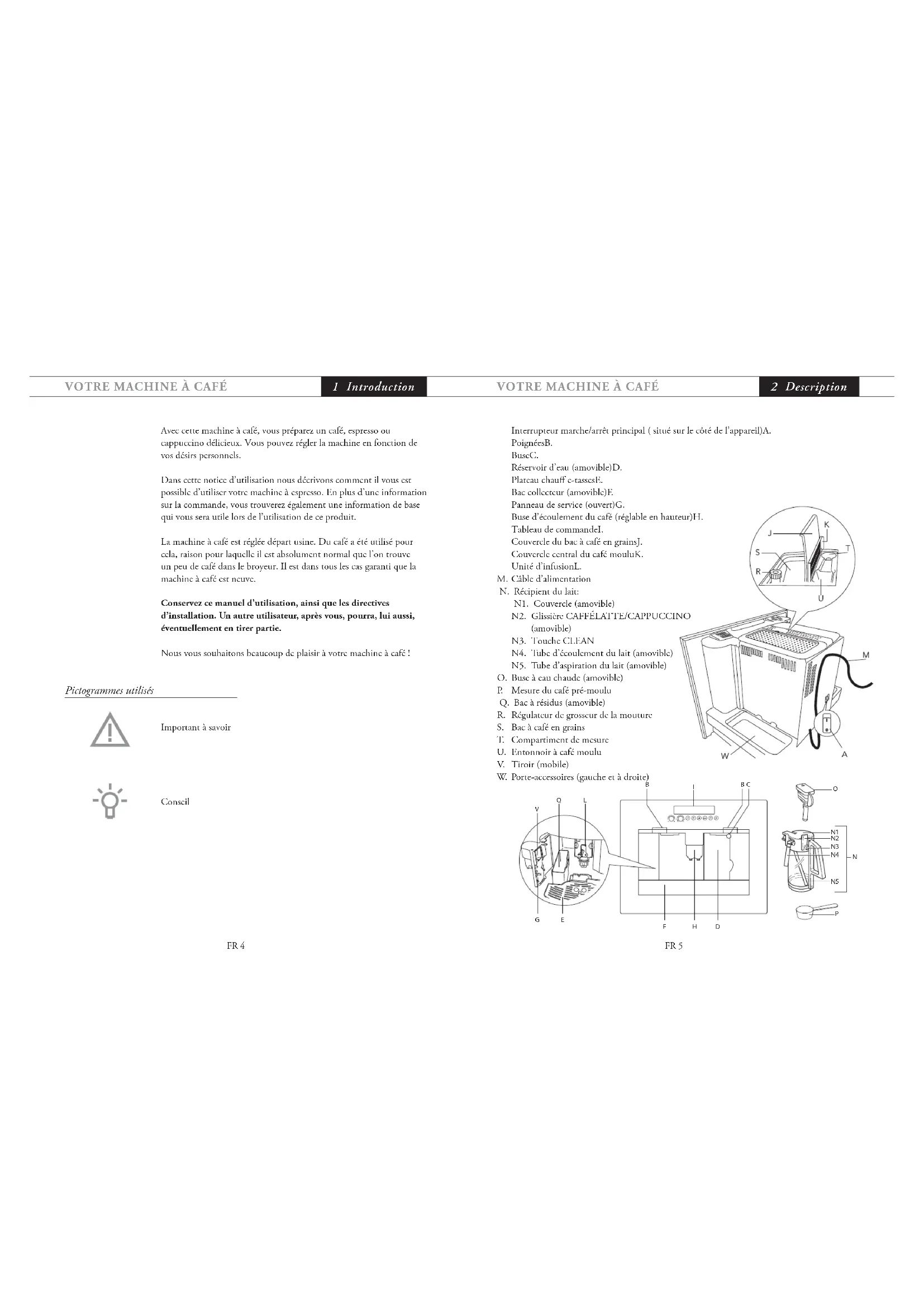 FR 5 Interrupteur marche/arrêt principal ( situé sur le côté de l’appareil)A. PoignéesB. BuseC. Réservoir d’eau (amovible)D. Plateau chauff e-tassesE. Bac collecteur (amovible)F. Panneau de service (ouvert)G. Buse d’écoulement du café (réglable en hauteur)H. Tableau de commandeI. Couvercle du bac à café en grainsJ. Couvercle central du café mouluK. Unité d’infusionL. Câble d’alimentationM. Récipient du lait:N. N1. Couvercle (amovible) N2. Glissière CAFFÉLATTE/CAPPUCCINO (amovible) N3. Touche CLEAN N4. Tube d’écoulement du lait (amovible) N5. Tube d’aspiration du lait (amovible) Buse à eau chaude (amovible)O. Mesure du café pré-mouluP. Bac à résidus (amovible)Q. Régulateur de grosseur de la moutureR. Bac à café en grainsS. Compartiment de mesureT. Entonnoir à café mouluU. Tiroir (mobile)V. Porte-accessoires (gauche et à droite)W.