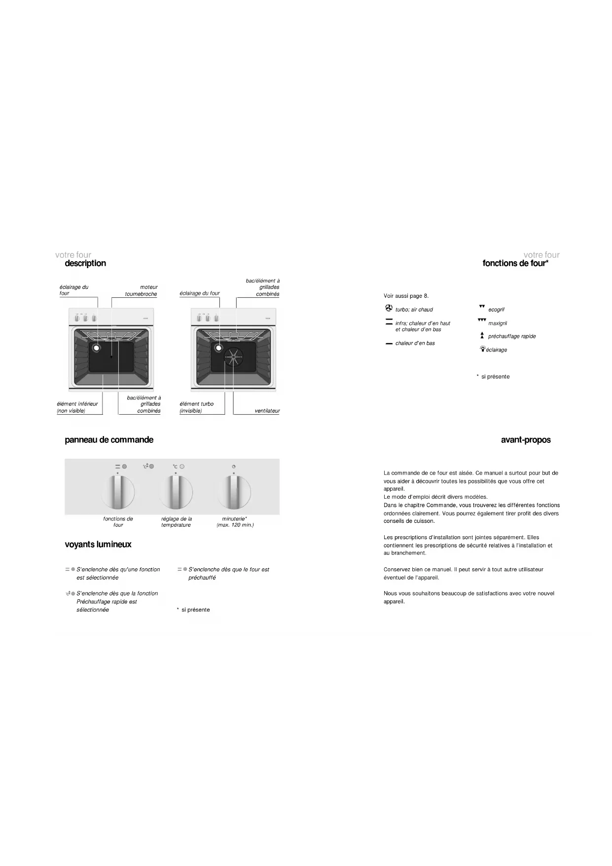 - CFK-vrij polystyreen (PS-hardschuim). Deze materialen op verantwoorde wijze en conform de overheidsbepalingen afvoeren. De overheid kan u ook informatie verschaffen over het op verantwoorde wijze afvoeren van afgedankte huishoudelijke apparaten.La commande de ce four est aisée. Ce manuel a surtout pour but de vous aider à découvrir toutes les possibilités que vous offre cet appareil. Le mode d'emploi décrit divers modèles. Dans le chapitre Commande, vous trouverez les différentes fonctions ordonnées clairement. Vous pourrez également tirer profit des divers conseils de cuisson. Les prescriptions d'installation sont jointes séparément. Elles contiennent les prescriptions de sécurité relatives à l'installation et au branchement. Conservez bien ce manuel. Il peut servir à tout autre utilisateur éventuel de l'appareil. Nous vous souhaitons beaucoup de satisfactions avec votre nouvel appareil. avant-propos votre four description éclairage du four moteur tournebroche éclairage du four ventilateur panneau de commande élément inférieur (non visible) bac/élément à grillades combinés élément turbo (invisible) bac/élément à grillades combinés votre four fonctions de four* Voir aussi page 8. turbo; air chaud infra; chaleur d'en haut et chaleur d'en bas chaleur d'en bas ecogril maxigril préchauffage rapide H éclairage
