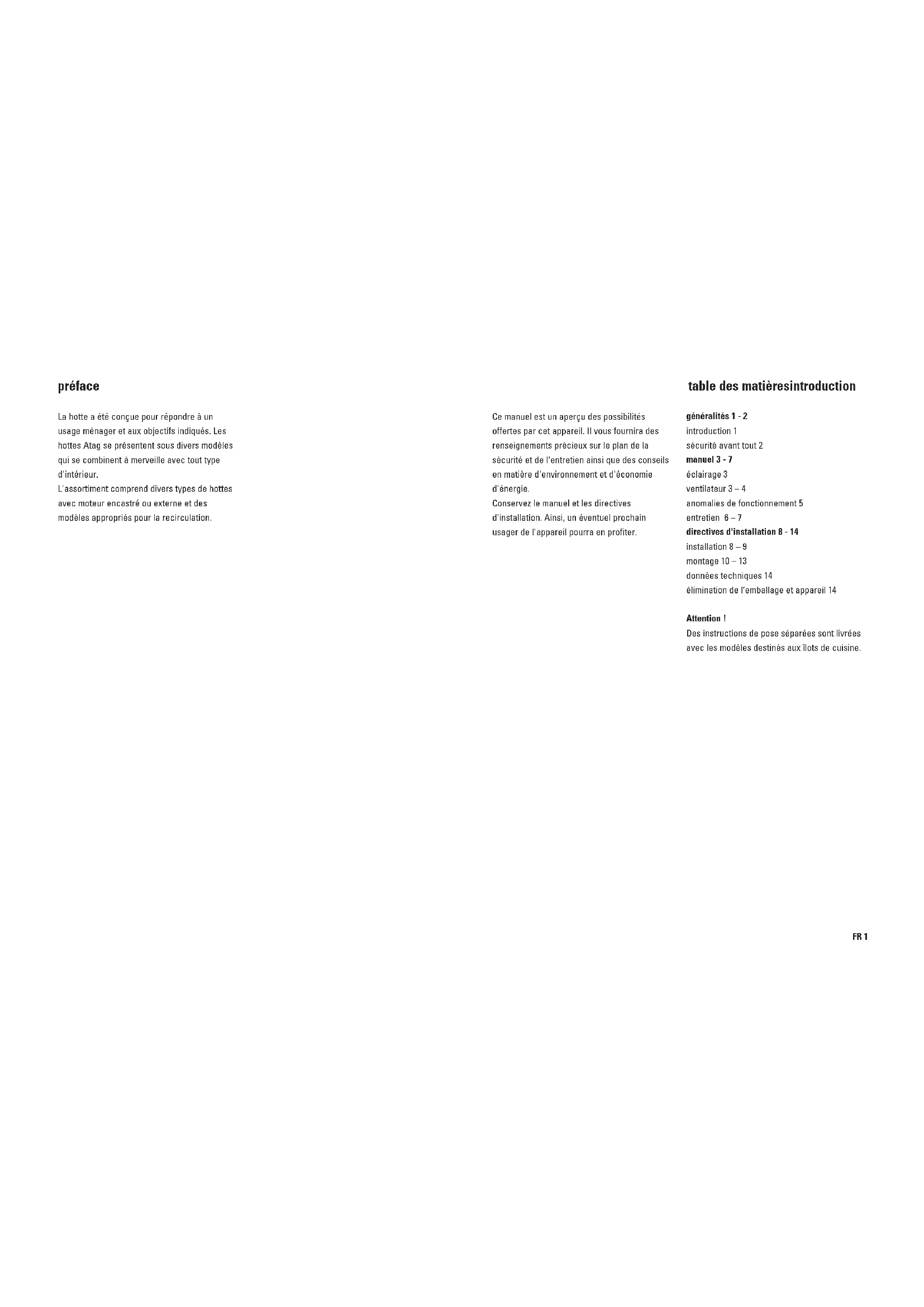 3GB 14 GB 15 technical data type number: see data plate in the hood power supply: 230 V - 50 Hz connected load: see data plate dimensions (h x w x d): see "fitting dimensions" approvals mark: Kema This appliance complies with the CE directives. external motors NB: For appliances with an external motor, ATAG recommends the use of the following types of external motors: WA111C5U WA300C5U The packaging of the appliance is recyclable. It can be made up of: – cardboard – polyethylene – CFC free polystyrene (PS rigid foam) – polypropylene straps around the box Please dispose of these materials in a responsible way in accordance with the regulations of your local authority. Your local authority will also be able to give you information about disposing disused household appliances in a responsible way. disposal of packaging and appliancesFR 1 table des matièresintroduction Ce manuel est un aperçu des possibilités offertes par cet appareil. Il vous fournira des renseignements précieux sur le plan de la sécurité et de l'entretien ainsi que des conseils en matière d'environnement et d'économie d'énergie. Conservez le manuel et les directives d'installation. Ainsi, un éventuel prochain usager de l'appareil pourra en profiter. généralités 1 - 2 introduction 1 sécurité avant tout 2 manuel 3 - 7 éclairage 3 ventilateur 3 – 4 anomalies de fonctionnement 5 entretien 6 – 7 directives d'installation 8 - 14 installation 8 – 9 montage 10 – 13 données techniques 14 élimination de l’emballage et appareil 14 Attention ! Des instructions de pose séparées sont livrées avec les modèles destinés aux îlots de cuisine. préface La hotte a été conçue pour répondre à un usage ménager et aux objectifs indiqués. Les hottes Atag se présentent sous divers modèles qui se combinent à merveille avec tout type d'intérieur. L'assortiment comprend divers types de hottes avec moteur encastré ou externe et des modèles appropriés pour la recirculation.FR 3 éclairage mise en/hors service de l'électricité Appuyez sur la touche pour l'éclairage. L'éclairage va s'enclencher sur la position maximale. Appuyez encore une fois sur la touche et vous aurez un éclairage plus doux. Appuyez une troisième fois pour éteindre la lumière. Le témoin lumineux sur la touche va s'éteindre. mise en service du ventilateur Appuyez sur la touche , ou . La hotte se met en marche sur la position programmée. Le chiffre sur la touche s’allume. réglage de la capacité d'aspiration Appuyez sur une touche avec une valeur plus élevée ou plus basse. Le chiffre sur la touche s’allume. position intensive Appuyez sur la touche . Le chiffre sur la touche s’allume.