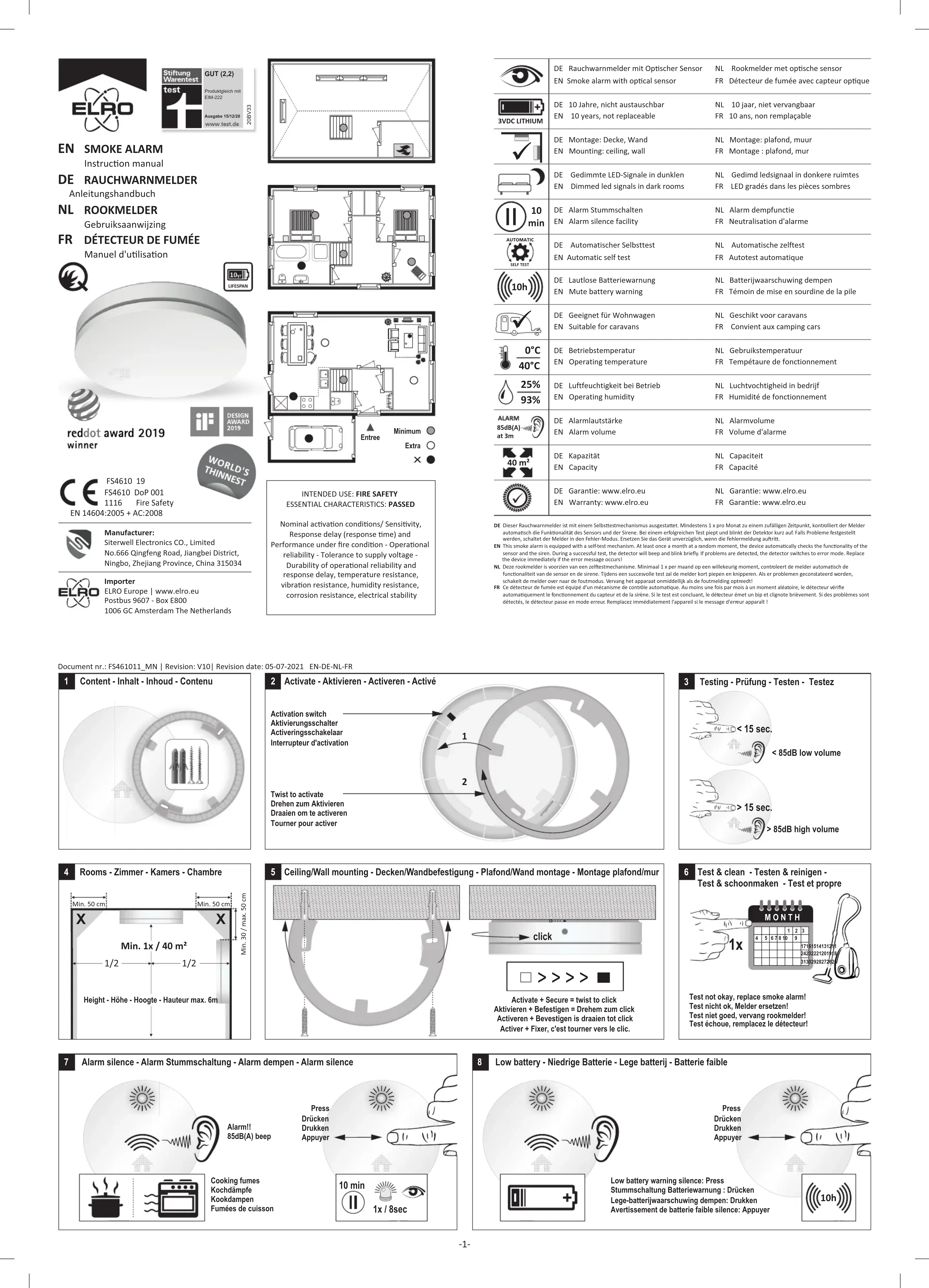 - Raadpleeg de lokale voorschrien. Probleemoplossing: Vals alarm wordt vaak veroorzaakt door stof of stoom. Bij twijfel: Verlaat het pand en onderneem ace! Aanvullende installaeinstruces: Gangen met max. breedte 3m: Max. 15m tussen 2 melders. Max 7,5m afstand tot voorzijde en melders in hoeken en kruisingen van gangen. Galerijen: Lengte en breedte >2m en >16m²: Extra melder onder galerij. Gedeeltelijke dakhelling: Vlak plafond ≤1m breed, beschouw als hellend dak. Vlak plafond >1m breed, beschouw als vlak plafond. FR - Symbols: Recyclage et mise au rebut: Le symbole WEEE signifie que ce produit et baeries ne doivent pas être jeté avec les ordures. Une fois le produit arrivée en fin de vie, déposez-la au centre de tri le plus proche de chez vous, où elle sera mise au rebut ou recyclée en toute sécurité. Protéger l'environnement, la santé des personnes et des ressources naturelles! Veuillez lire aenvement le manuel avant ulisaon et le conserver à un endroit sûr. Déclaraon de Performance (DoP) aller à www.elro.eu. Averssements: