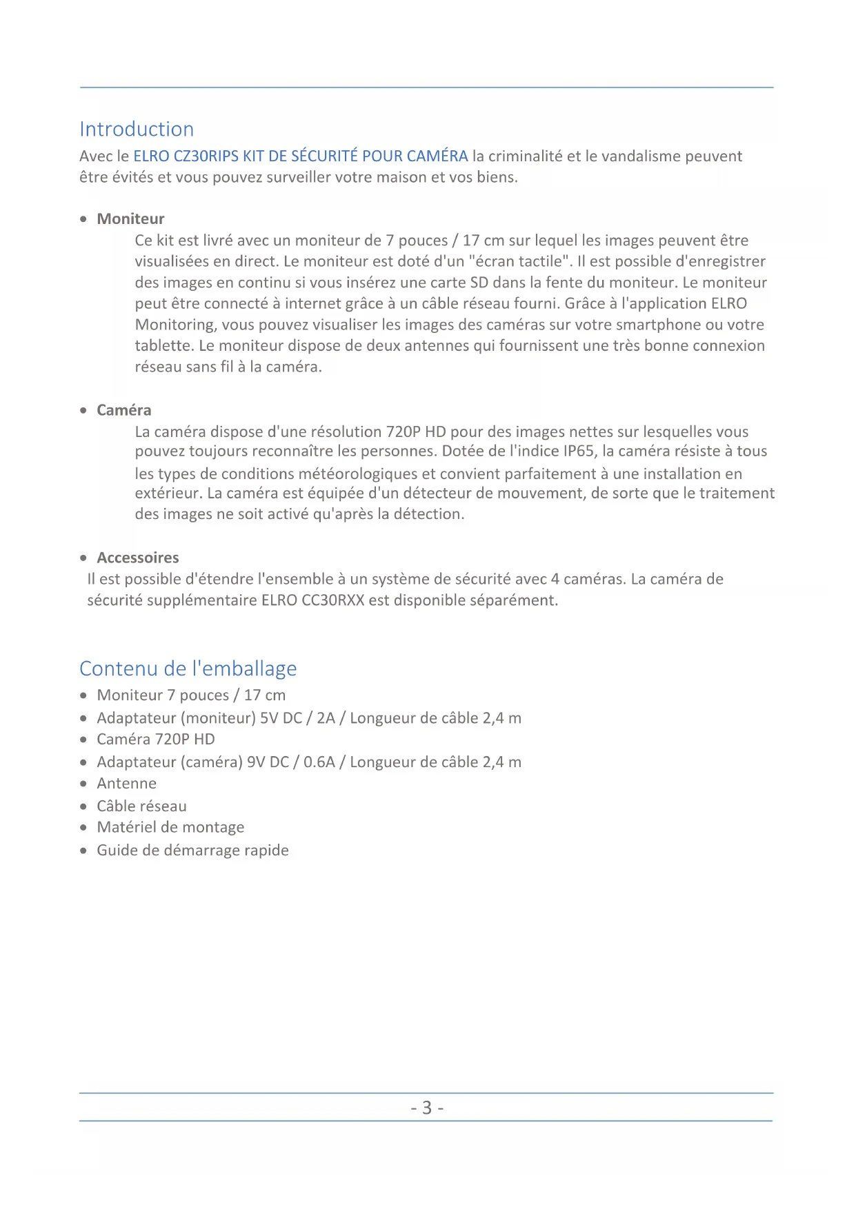 - Accessoires Il est possible d'étendre l'ensemble à un système de sécurité avec 4 caméras. La caméra de sécurité supplémentaire ELRO CC30RXX est disponible séparément. Contenu de l'emballage