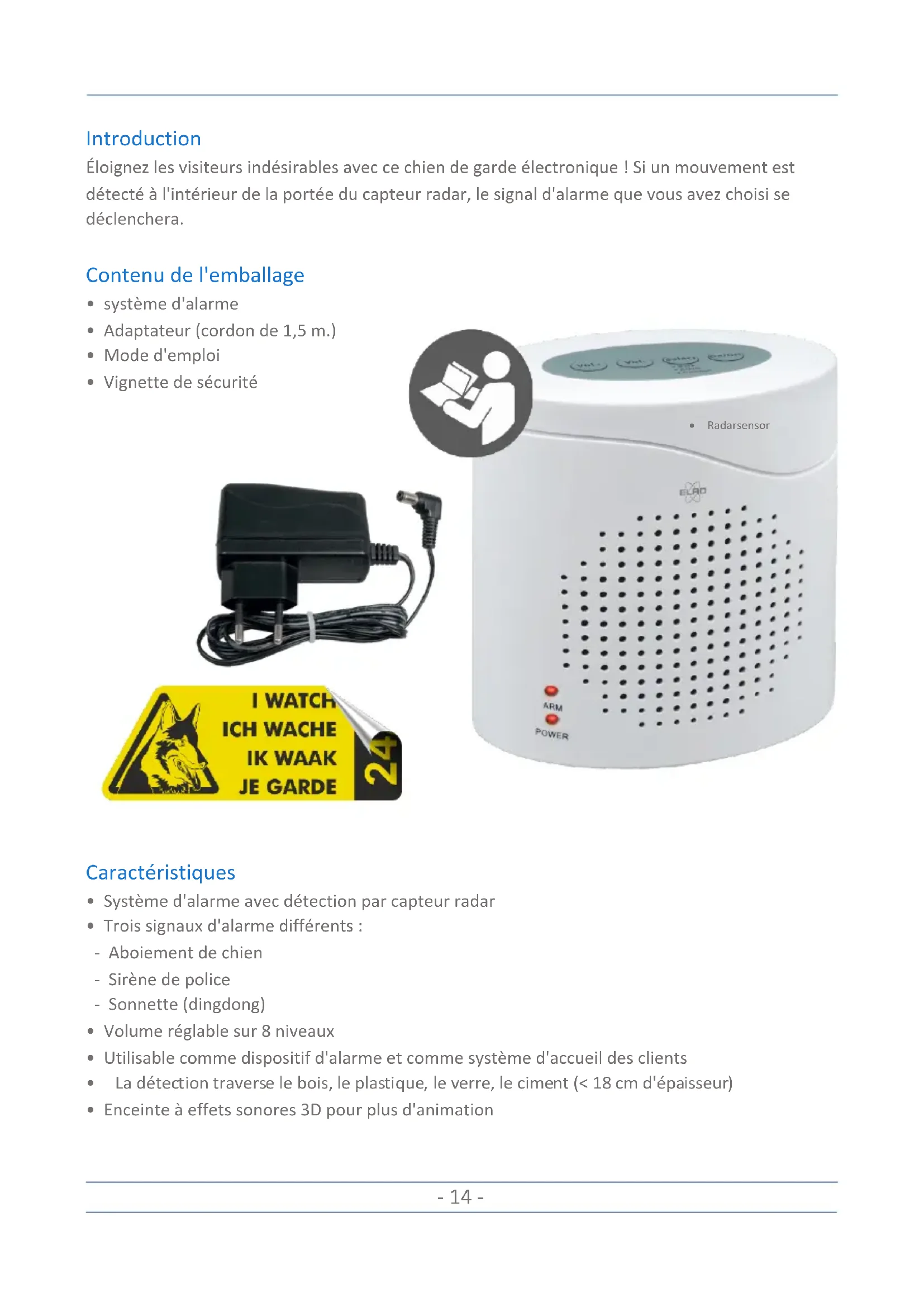 - ELRO Europe n'est pas responsable des pertes ou dommages causés par le bon ou mauvais fonctionnement de la centrale d'alarme. Caractéristiques techniques Niveau de volume de l'alarme Réglable de 70 à un maximum de 120 dB(A) Portée du capteur radar Max. 9-16 m détecté depuis l'arrière Angle de détection 360° Consommation ≤ 6W Tension de fonctionnement 12V DC Courant de fonctionnement 1 A Courant à l'arrêt ≤ 20 mA Courant en fonctionnement ≤ 500 mA Dimensions 150 mm (H)*160 mm (L)*110 mm (P) Poids net 765 g Poids brut 790 g- 17 - Conformité Le symbole WEEE (DEEE) signifie que ce produit et ses piles doivent être triés séparément des ordures ménagères. Une fois que ce produit a dépassé sa durée d'utilisation, apportez- le à un point de collecte des déchets à proximité pour assurer son élimination ou son recyclage en toute sécurité. Protéger l'environnement et la santé publique et gérer les ressources naturelles de manière. responsable. ! En apposant le marquage CE sur un produit, le fabricant déclare que le produit satisfait à toutes les exigences légales du marquage CE et peut être vendu dans l'EEE. Déclaration de conformité simplifiée de l'UE Le soussigné, ELRO Europe, déclare que l'équipement radioélectrique du type ELRO ARD51 Electronic Guard Dog est conforme à la directive 2014/53/UE. Le texte complet de la déclaration UE de conformité est disponible à l'adresse internet suivante: www.elro.eu/doc. Service et contact Souhaitez-vous nous contacter ? Afin d'assurer à nos clients le meilleur service possible dans les meilleurs délais, nous vous demandons de prendre en compte les critères suivants : Pour toute question concernant l'installation, l'utilisation ou le fonctionnement de ce produit :