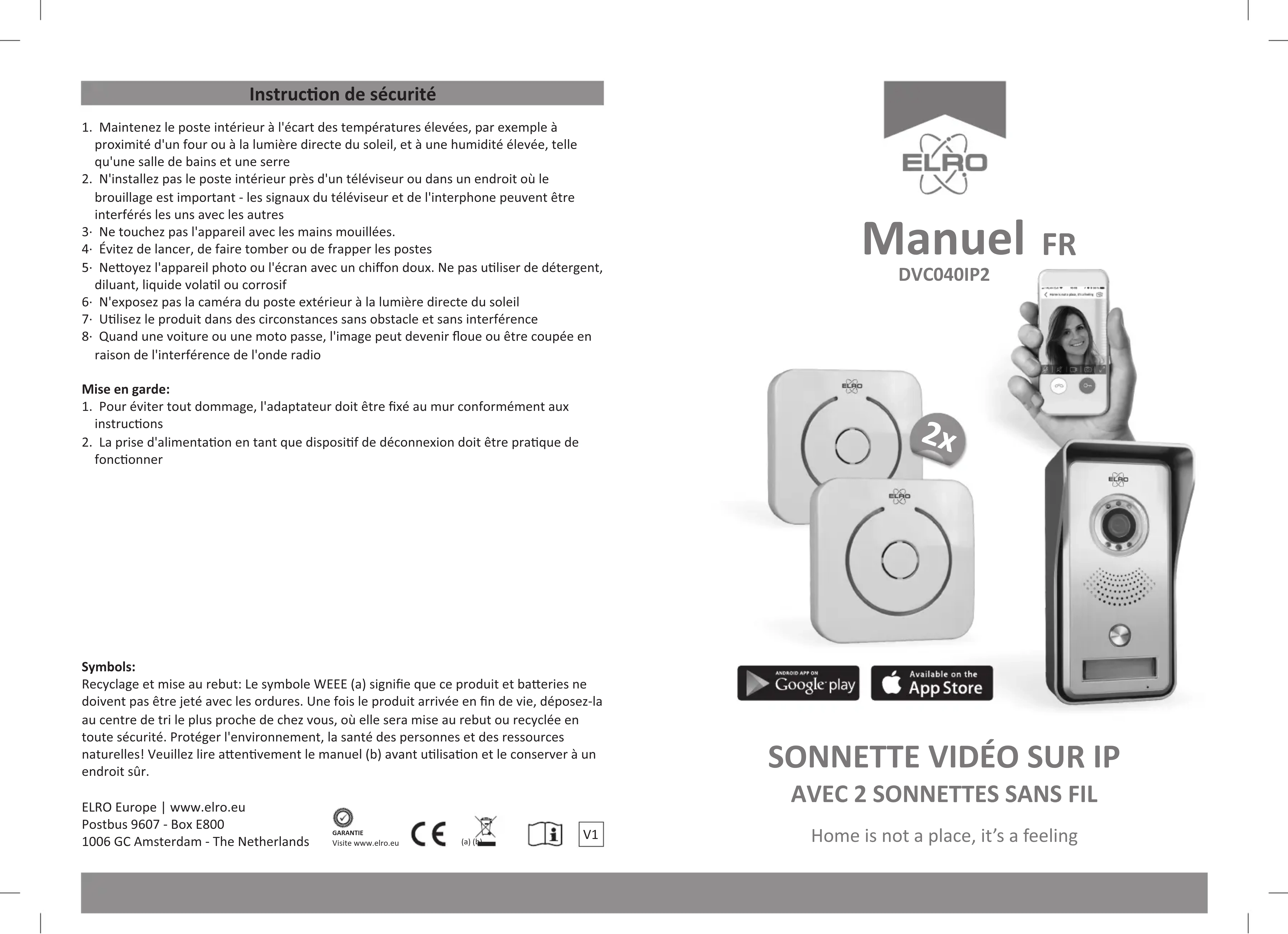 Home is not a place, it’s a feelingHome is not a place, it’s a feelingHome is not a place, it’s a feeling Symbols: Recyclage et mise au rebut: Le symbole WEEE (a) signifie que ce produit et baeries ne doivent pas être jeté avec les ordures. Une fois le produit arrivée en fin de vie, déposez-la au centre de tri le plus proche de chez vous, où elle sera mise au rebut ou recyclée en toute sécurité. Protéger l'environnement, la santé des personnes et des ressources naturelles! Veuillez lire aenvement le manuel (b) avant ulisaon et le conserver à un endroit sûr. ELRO Europe | www.elro.euPostbus 9607 - Box E8001006 GC Amsterdam - The NetherlandsüGARANTIEVisite www.elro.eu(a) (b) Instrucon de sécurité1. Maintenez le poste intérieur à l'écart des températures élevées, par exemple à proximité d'un four ou à la lumière directe du soleil, et à une humidité élevée, telle qu'une salle de bains et une serre2. N'installez pas le poste intérieur près d'un téléviseur ou dans un endroit où le brouillage est important - les signaux du téléviseur et de l'interphone peuvent être interférés les uns avec les autres3· Ne touchez pas l'appareil avec les mains mouillées.4· Évitez de lancer, de faire tomber ou de frapper les postes5· Neoyez l'appareil photo ou l'écran avec un chiffon doux. Ne pas uliser de détergent, diluant, liquide volal ou corrosif6· N'exposez pas la caméra du poste extérieur à la lumière directe du soleil7· Ulisez le produit dans des circonstances sans obstacle et sans interférence8· Quand une voiture ou une moto passe, l'image peut devenir floue ou être coupée en raison de l'interférence de l'onde radioMise en garde:1. Pour éviter tout dommage, l'adaptateur doit être fixé au mur conformément aux instrucons2. La prise d'alimentaon en tant que disposif de déconnexion doit être praque de fonconner SONNETTE VIDÉO SUR IPSONNETTE VIDÉO SUR IP AVEC 2 SONNETTES SANS FILAVEC 2 SONNETTES SANS FIL