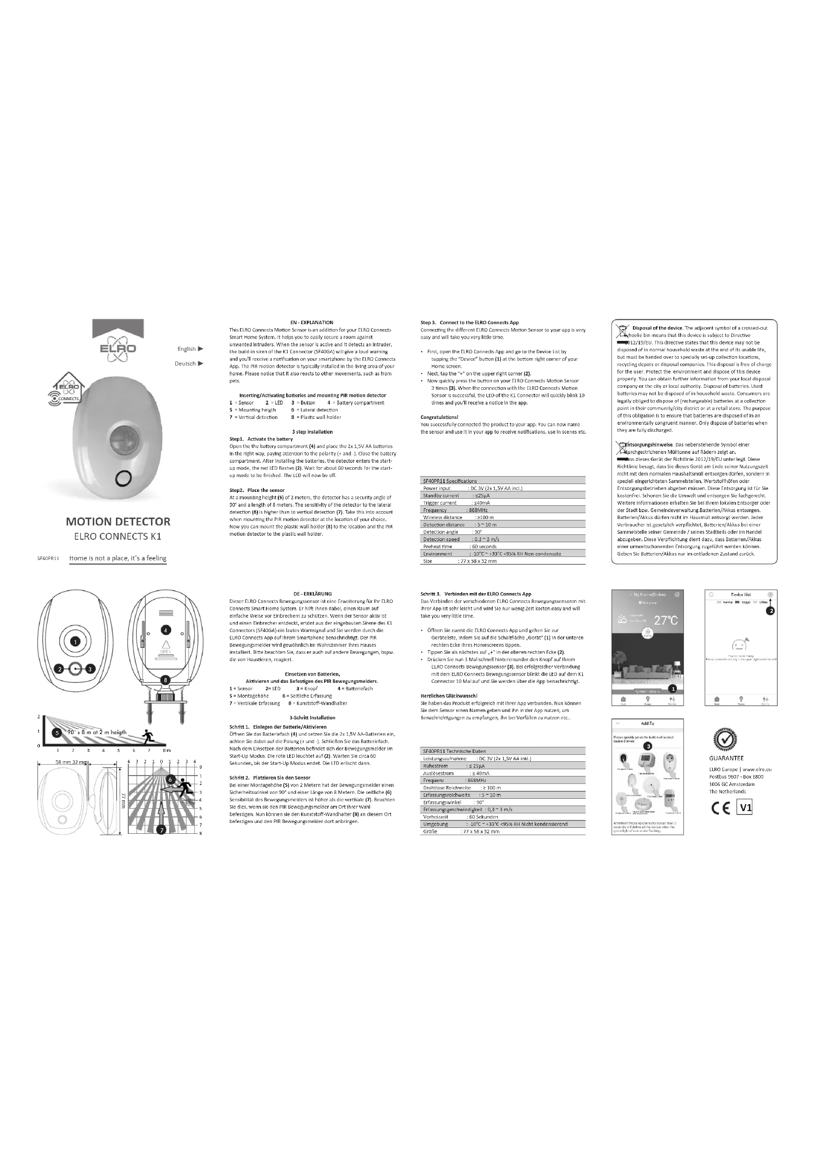 NL - UITLEGDeze ELRO Connects Bewegingssensor is een toevoeging aan je ELRO Connects Smart Home Systeem. Het helpt je om een ruimte makkelijk te beveiligen tegen ongewenste gasten. Als de sensor acef is en het bespeurt een indringer, zal het ingebouwde alarm van de K1 Connector (SF40GA) een luide waarschuwing geven en ontvang je via de ELRO Connects App een melding op je smartphone. De PIR bewegingsmelder is normaal gesproken geïnstalleerd in het woongedeelte van je huis. Let op dat het ook reageert op andere bewegingen, bijvoorbeeld van huisdieren.Plaatsen/Acveren van baerijen en PIR bewegingssensor monteren 1 = Sensor 2 = LED 3 = Knopje 4 = Baerijvak 5 = Monteerhoogte 6 = Zijkant detece7 = Vercale detece 8 = Plasc wandhouder3-staps installaeStap 1. Acveer de baerijOpen het baerijvak (4) en plaats de 2x 1,5V AA baerijen op de goede manier, leend op de polen (+ en -). Sluit het baerijvak. Na het plaatsen van de baerijen gaat de melder in opstartmodus, het rode ledlicht knippert (2). Wacht ongeveer 60 seconden tot de opstartmodus klaar is. Het ledlicht is nu uit.Stap 2. Plaats de sensorOp een monteerhoogte (5) van 2 meter hee de melder een beveiligingshoek van 90° en een lengte van 8 meter. De gevoeligheid van de zijwaartse detece (6) van de melder is hoger dan de vercale detece (7). Houd hier rekening mee als u de PIR bewegingsmelder monteert op de door u gekozen plek. U kunt nu de plasc wandhouder (8) monteren op de gekozen plek en de PIR bewegingsmelder aan de plasc wandhouder bevesgen.FR - EXPLICATIONCe capteur de mouvement ELRO Connects est un ajout à votre système ELRO Connects pour votre maison intelligente. Il vous permera de protéger facilement une pièce contre les cambrioleurs. Si le détecteur est acf et qu'il détecte un intrus, la sirène intégrée du connecteur K1 (SF40GA) donnera un signal sonore et vous recevrez une noficaon sur votre smartphone par l'applicaon ELRO Connects. Le système de détecon de mouvement PIR est généralement installé dans la zone résidenelle de votre maison. Veuillez noter qu'il peut aussi réagir à d'autres mouvements, comme ceux des animaux de compagnie.Inseron/acvaon des piles et montage du détecteur de mouvement 1 = Capteur 2 = LED 3 = Bouton 4 = Comparment de la baerie 5 = Hauteur de montage 6 = Détecon latérale7 = détecon vercale 8 = Support mural en plasqueInstallaon en 3 étapesÉtape 1. Acver la baerieDéverrouillez le comparment des piles (4) et placez les 2 piles 1,5V AA dans le bon sens, en respectant la polarité (+ et -). Bouclez le comparment des piles. Après avoir installé les piles, le détecteur entre en mode de démarrage, la LED rouge clignote (2). Aendez environ 60 secondes pour que le mode de démarrage soit terminé. La LED est désormais éteinte.Step 2. Placer le capteurA une hauteur de montage (5) de 2 mètres, le détecteur a un angle de sécurité de 90° et une longueur de 8 mètres. La sensibilisaon du détecteur à la mesure latérale (6) est supérieure à la vercale (7). Il est important de vous en tenir compte lors du montage du détecteur de mouvement PIR à son emplacement selon votre choix.A présent, vous pouvez monter le support mural en plasque (8) sur l'emplacement et le détecteur de mouvement PIR sur le support mural en plasque.Stap 3. Verbind Bewegingssensor met de ELRO Connects AppHet verbinden van de andere ELRO Connects Bewegingsmelder met uw app is erg gemakkelijk en snel gedaan. Ÿ Open eerst de ELRO Connects App en ga naar de Apparaatlijst door te kken op het ''Apparaat'' knopje (1) rechtsonder op het startscherm. Ÿ Tik vervolgens op de ''+'' in de rechter bovenhoek (2). Ÿ Druk nu 3 keer snel op het knopje van de ELRO Connects Bewegingssensor (3). Als de verbinding met de ELRO Connects Bewegingssensor succesvol is, zal het ledlicht van de K1 Connector 10 keer snel knipperen en zal er een melding in de app verschijnenGefeliciteerd! U hebt het product succesvol verbonden met de app. U kunt nu de sensor een naam geven en deze in de app gebruiken om meldingen te ontvangen, om in beelden te gebruiken etc.Étape 3. Connecter à l'applicaon ELRO ConnectsLe branchement des différents capteurs de mouvement ELRO Connects à votre applicaon est très simple et ne vous demandera que très peu de temps. Ÿ Pour commencer, ouvrez l'applicaon ELRO Connects et accédez à la liste des périphériques en pressant le bouton “Device” (1) dans le coin inférieur droit de votre écran d'accueil. Ÿ Puis appuyez sur le signe “+” dans le coin supérieur droit (2). Ÿ A présent, appuyez rapidement sur le bouton de votre capteur de mouvement ELRO connects 3 fois (3). Une fois la connexion réussie avec ce capteur de mouvement ELRO Connects, la LED du connecteur K1 clignotera rapidement 10 fois et vous recevrez un signal dans l'applicaon.Félicitaons ! Vous avez correctement connecté le produit à votre applicaon. Vous pouvez désormais nommer le capteur et l'uliser dans votre applicaon pour recevoir des noficaons, l'uliser dans des scènes, etc.. Nederlands Français