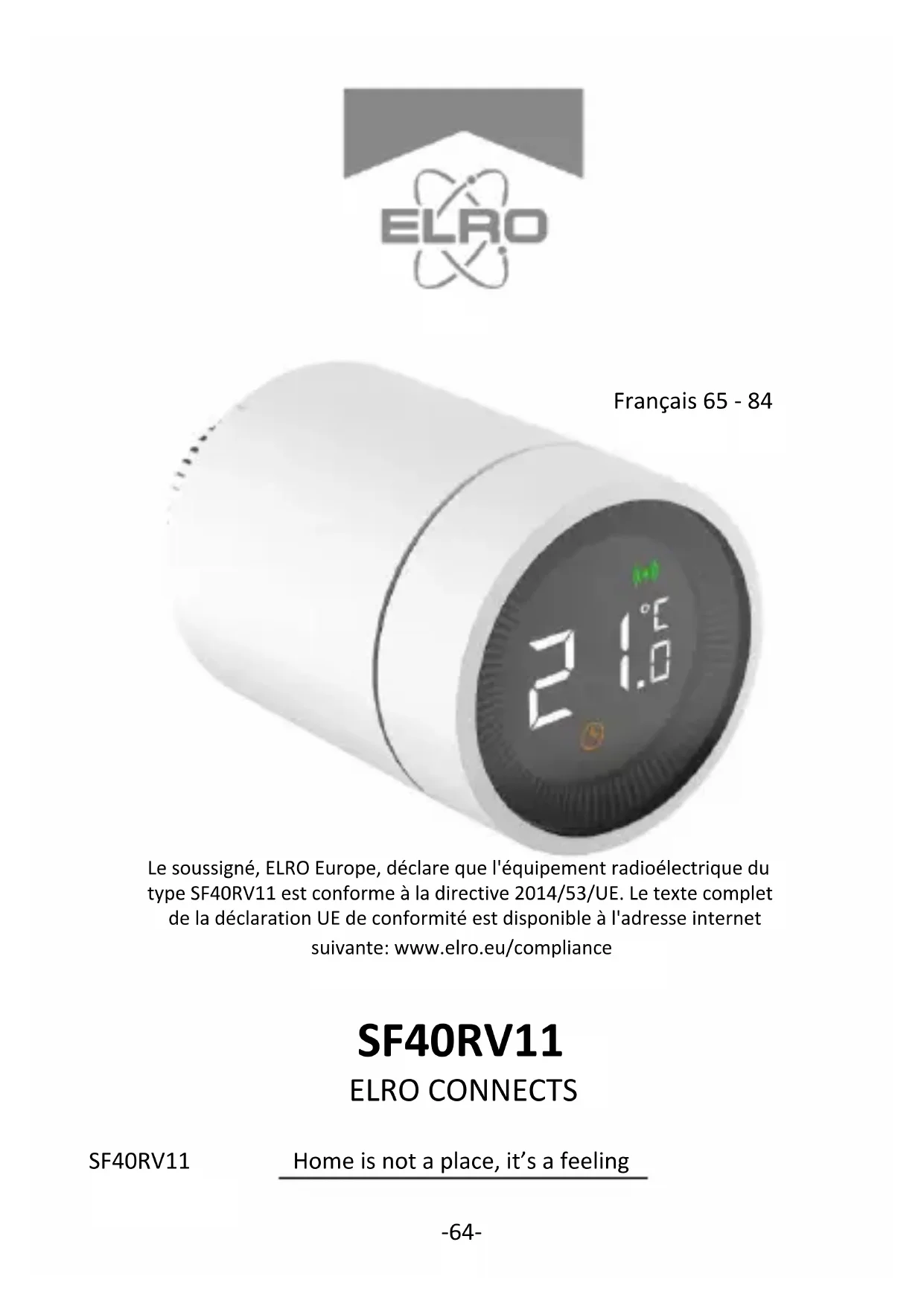 Le soussigné, ELRO Europe, déclare que l'équipement radioélectrique du type SF40RV11 est conforme à la directive 2014/53/UE. Le texte complet de la déclaration UE de conformité est disponible à l'adresse internet suivante: www.elro.eu/compliance SF40RV11 ELRO CONNECTS SF40RV11 Home is not a place, it’s a feeling-65- Vue d'ensemble Félicitations pour votre achat du SF40RV. Avec cette vanne de radiateur intelligente, vous avez un contrôle total sur le chauffage de votre maison et même à distance. L'appareil est facile à connecter à votre système ELRO Smart Home. Explication du produit Caractéristiques