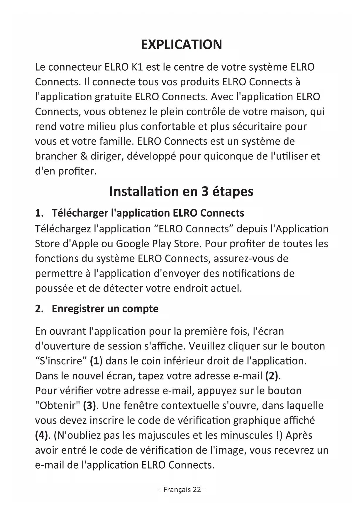 En ouvrant l'applicaon pour la première fois, l'écran d'ouverture de session s'affiche. Veuillez cliquer sur le bouton “S'inscrire” (1) dans le coin inférieur droit de l'applicaon. Dans le nouvel écran, tapez votre adresse e-mail (2). Pour vérifier votre adresse e-mail, appuyez sur le bouton "Obtenir" (3). Une fenêtre contextuelle s'ouvre, dans laquelle vous devez inscrire le code de vérificaon graphique affiché (4). (N'oubliez pas les majuscules et les minuscules !) Après avoir entré le code de vérificaon de l'image, vous recevrez un e-mail de l'applicaon ELRO Connects.- Français 23 - Si vous vérifiez le courrier électronique sur votre téléphone, vous devrez rouvrir l'applicaon ELRO Connects, remplissez à nouveau votre adresse e- mail et le code de vérificaon que vous en avez reçu doit être rempli dans l'applicaon à gauche du bouton "Obtenir" (3).