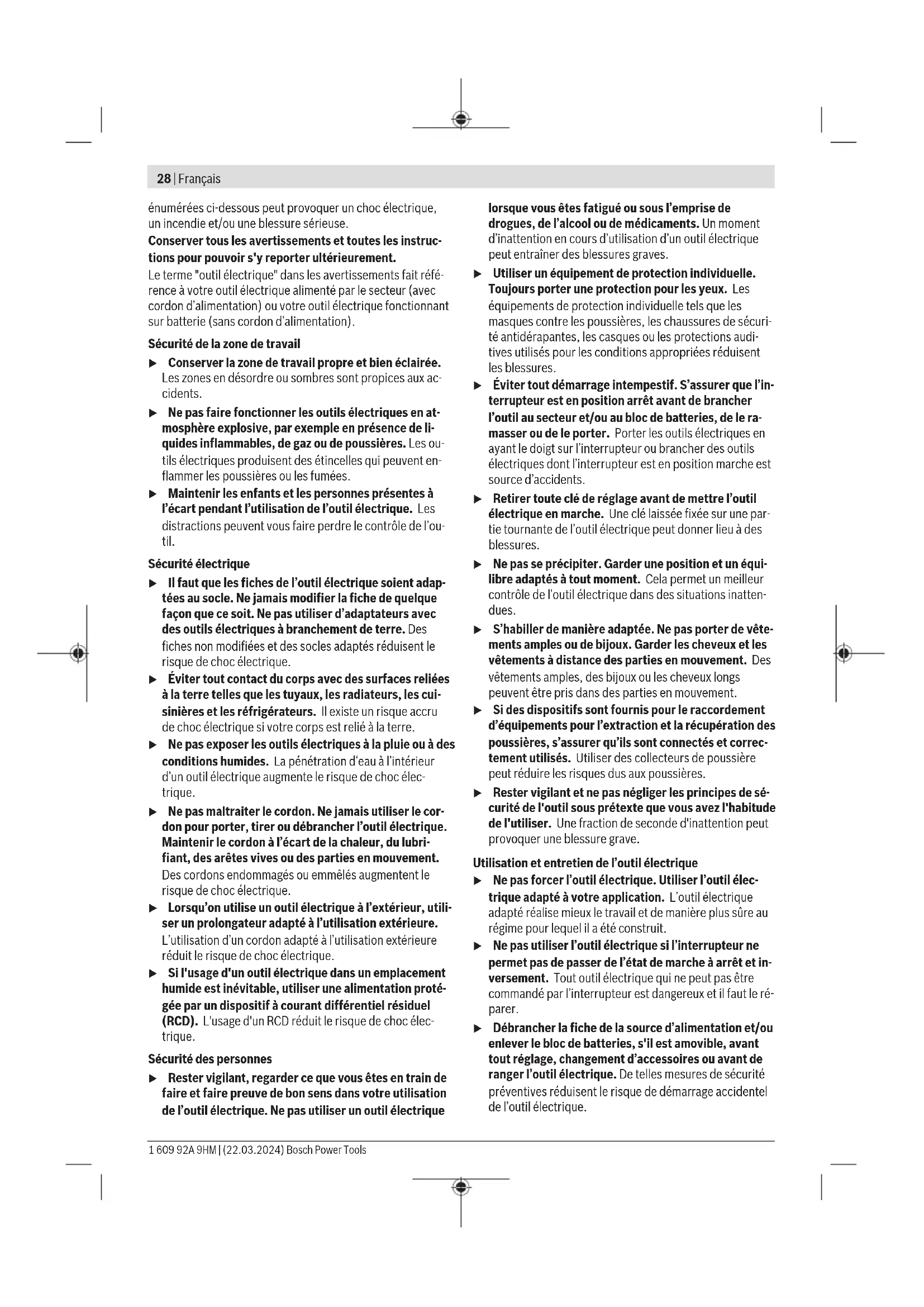 Switching On With Locking Mechanism To start the power tool, first press the on/off switch(2) ➊, then slide it forwards ➋ and then press and hold it ➌. To lock the pressed on/off switch(2), slide the on/off switch(2) further forwards ➍.To switch off the power tool, release the on/off switch(2);or, if the switch is locked, briefly press the on/off switch(2)and then release it.Switching On Without Locking Mechanism To start the power tool, first press the on/off switch(2) ➊, then slide it forwards ➋ and then press and hold it ➌. To switch off the power tool, release the on/off switch(2).u Always check abrasive tools before using them. Theabrasive tool must be fitted properly and be able tomove freely. Carry out a test run for at least oneminute with no load. Do not use abrasive tools that aredamaged, run untrue or vibrate during use. Damagedabrasive tools can burst apart and cause injuries. Maintenance and Service Maintenance and Cleaning u Pull the plug out of the socket before carrying out anywork on the power tool.u To ensure safe and efficient operation, always keepthe power tool and the ventilation slots clean.u In extreme conditions, always use a dust extractor ifpossible. Blow out ventilation slots frequently and in-stall a residual current device (RCD) upstream. Whenmachining metals, conductive dust can settle inside thepower tool, which can affect its protective insulation.Store and handle the accessories carefully.In order to avoid safety hazards, if the power supply cordneeds to be replaced, this must be done by Bosch or by anafter-sales service centre that is authorised to repair Boschpower tools. After-Sales Service and Application Service Our after-sales service responds to your questions concern-ing maintenance and repair of your product as well as spareparts. You can find explosion drawings and information onspare parts at: www.bosch-pt.comThe Bosch product use advice team will be happy to help youwith any questions about our products and their accessor- ies. In all correspondence and spare parts orders, please alwaysinclude the 10‑digit article number given on the nameplateof the product.Great BritainRobert Bosch Ltd. (B.S.C.) P.O. Box 98 Broadwater Park North Orbital Road Denham UxbridgeUB 9 5HJ At www.bosch-pt.co.uk you can order spare parts or arrangethe collection of a product in need of servicing or repair. Tel. Service: (0344) 7360109 E-Mail: boschservicecentre@bosch.comYou can find further service addresses at:www.bosch-pt.com/serviceaddresses Disposal The power tool, accessories and packaging should be re-cycled in an environmentally friendly manner.Do not dispose of power tools along withhousehold waste.Only for EU countries:According to the European Directive 2012/19/EU on WasteElectrical and Electronic Equipment and its implementationinto national law, power tools that are no longer usable mustbe collected separately and disposed of in an environment-ally friendly manner.If disposed incorrectly, waste electrical and electronicequipment may have harmful effects on the environment andhuman health, due to the potential presence of hazardoussubstances.Only for United Kingdom:According to The Waste Electrical and Electronic EquipmentRegulations 2013 (SI 2013/3113) (as amended), productsthat are no longer usable must be collected separately anddisposed of in an environmentally friendly manner. Français Consignes de sécurité Avertissements de sécurité généraux pour l’outil électrique AVERTISSE- MENT Lire tous les avertissements de sé-curité, les instructions, les illustra-tions et les spécifications fournisavec cet outil électrique. Ne pas suivre les instructionsBosch Power Tools 1 609 92A 9HM | (22.03.2024)28 | Français énumérées ci-dessous peut provoquer un choc électrique, un incendie et/ou une blessure sérieuse. Conserver tous les avertissements et toutes les instruc- tions pour pouvoir s'y reporter ultérieurement. Le terme "outil électrique" dans les avertissements fait réfé- rence à votre outil électrique alimenté par le secteur (avec cordon d’alimentation) ou votre outil électrique fonctionnant sur batterie (sans cordon d’alimentation). Sécurité de la zone de travail u Conserver la zone de travail propre et bien éclairée. Les zones en désordre ou sombres sont propices aux ac- cidents. u Ne pas faire fonctionner les outils électriques en at- mosphère explosive, par exemple en présence de li- quides inflammables, de gaz ou de poussières. Les ou- tils électriques produisent des étincelles qui peuvent en- flammer les poussières ou les fumées. u Maintenir les enfants et les personnes présentes à l’écart pendant l’utilisation de l’outil électrique. Les distractions peuvent vous faire perdre le contrôle de l’ou- til. Sécurité électrique u Il faut que les fiches de l’outil électrique soient adap- tées au socle. Ne jamais modifier la fiche de quelque façon que ce soit. Ne pas utiliser d’adaptateurs avec des outils électriques à branchement de terre. Des fiches non modifiées et des socles adaptés réduisent le risque de choc électrique. u Éviter tout contact du corps avec des surfaces reliées à la terre telles que les tuyaux, les radiateurs, les cui- sinières et les réfrigérateurs. Il existe un risque accru de choc électrique si votre corps est relié à la terre. u Ne pas exposer les outils électriques à la pluie ou à des conditions humides. La pénétration d‘eau à l’intérieur d’un outil électrique augmente le risque de choc élec- trique. u Ne pas maltraiter le cordon. Ne jamais utiliser le cor- don pour porter, tirer ou débrancher l’outil électrique. Maintenir le cordon à l’écart de la chaleur, du lubri- fiant, des arêtes vives ou des parties en mouvement. Des cordons endommagés ou emmêlés augmentent le risque de choc électrique. u Lorsqu’on utilise un outil électrique à l’extérieur, utili- ser un prolongateur adapté à l’utilisation exté