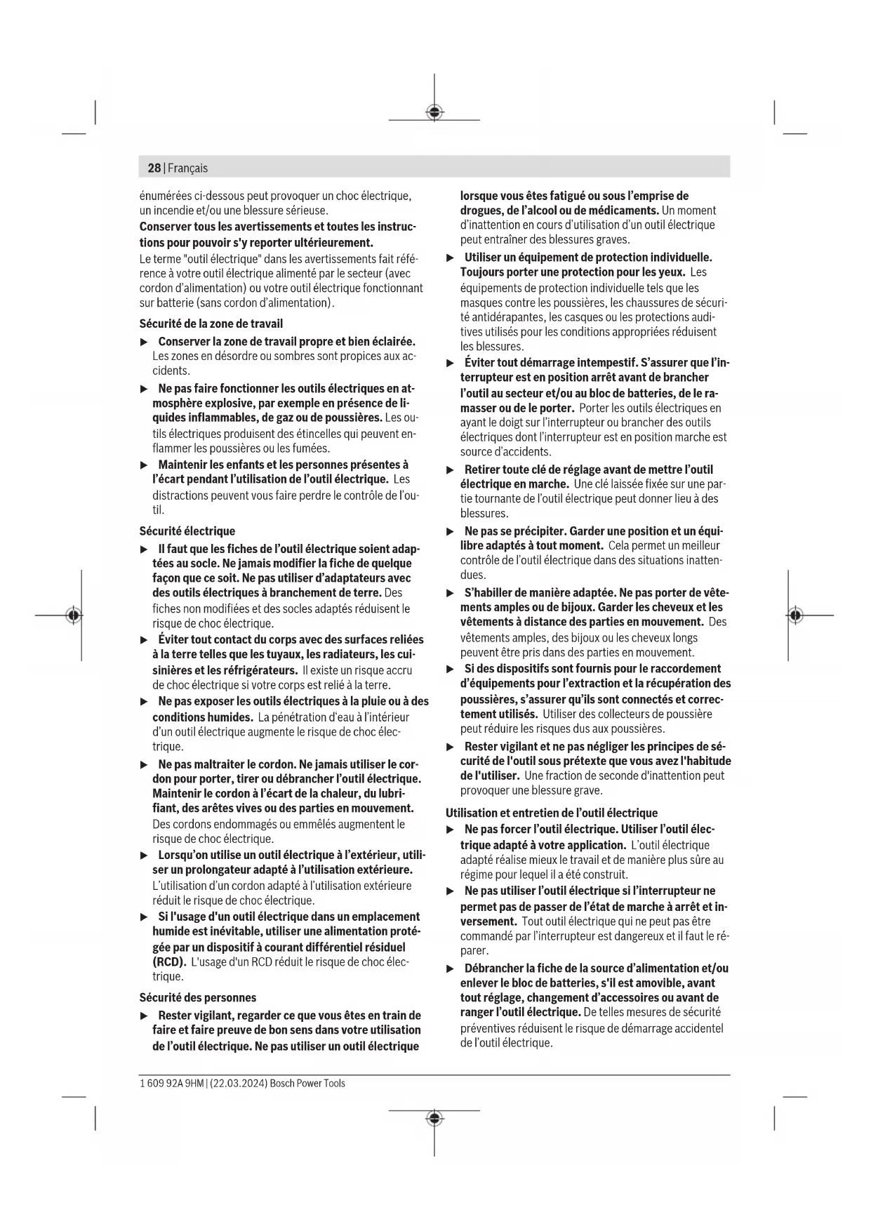 max . Si la valeur de Z max n’est pas connue, déterminez Z max en concertation avec le fournisseur réseau ou l’autorité compétente. Les valeurs peuvent varier selon le produit, les conditions d’utilisation et les conditions ambiantes. Pour plus d’informations, rendez-vous sur www.bosch-professional.com/wac. Informations sur le niveau sonore / les vibrations Valeurs d’émissions sonores déterminées conformément àENIEC62841-2-3. Le niveau sonore pondéré A typique de l’outil électroportatif est typiquement de: niveau de pression acoustique96dB(A); niveau de puissance acoustique104dB(A). Incertitude K=3dB. Portez un casque antibruit! Bosch Power Tools 1 609 92A 9HM | (22.03.2024)34 | Français Valeurs globales de vibration a