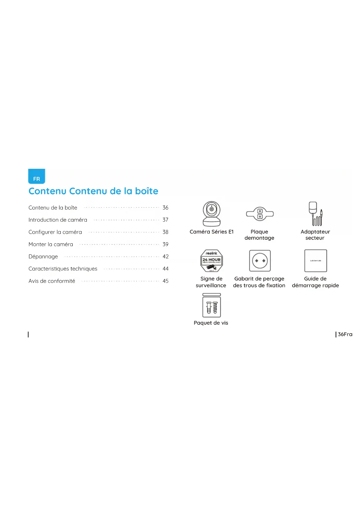 Contenu Contenu de la boîte Contenu de la boîte Introduction de caméra Configurer la caméra Monter la caméra Dépannage Caracteristiques techniques Avis de conformité