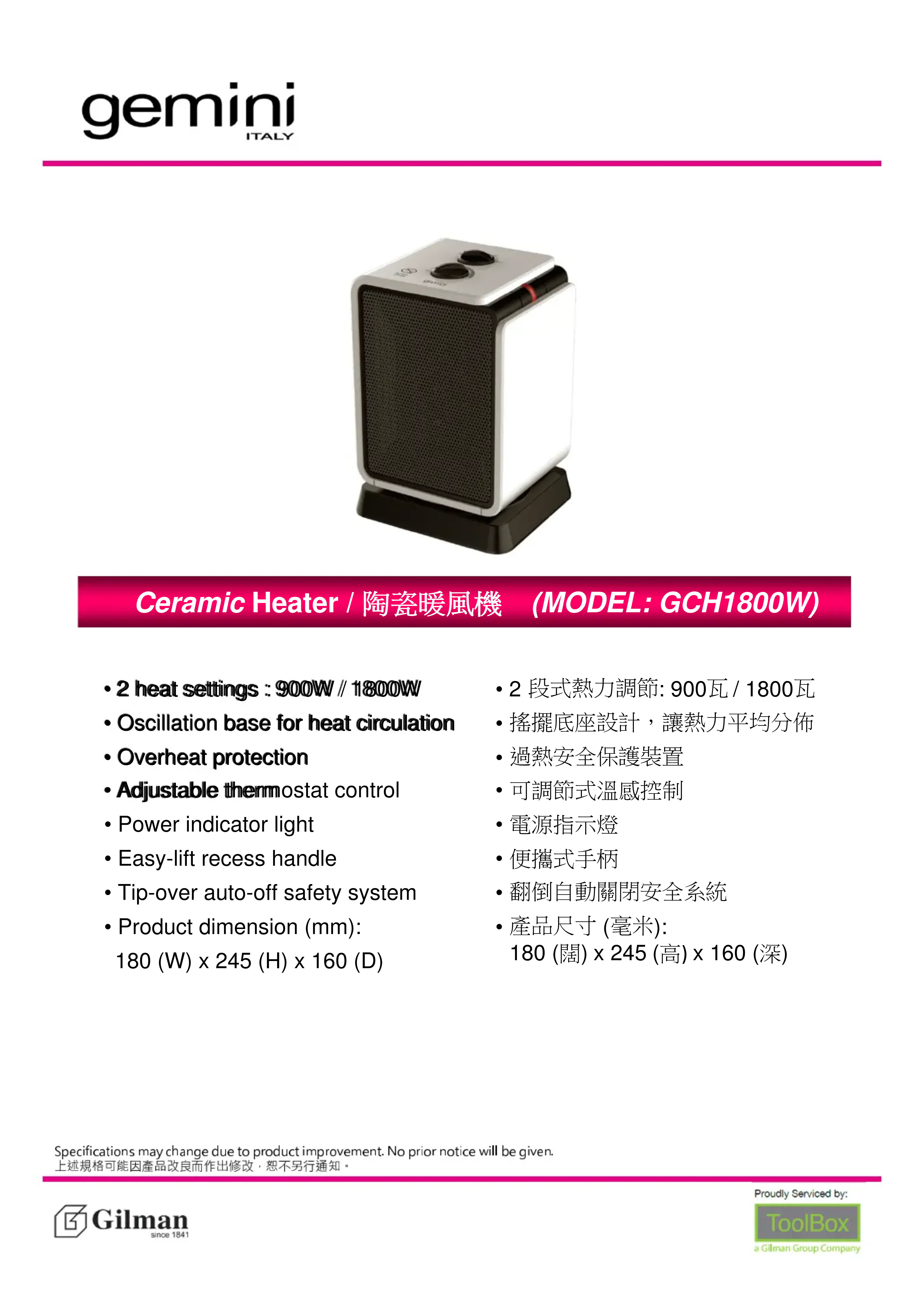 GCH1800W - Chauffage électrique GEMINI - Notice d'utilisation et mode d'emploi gratuit