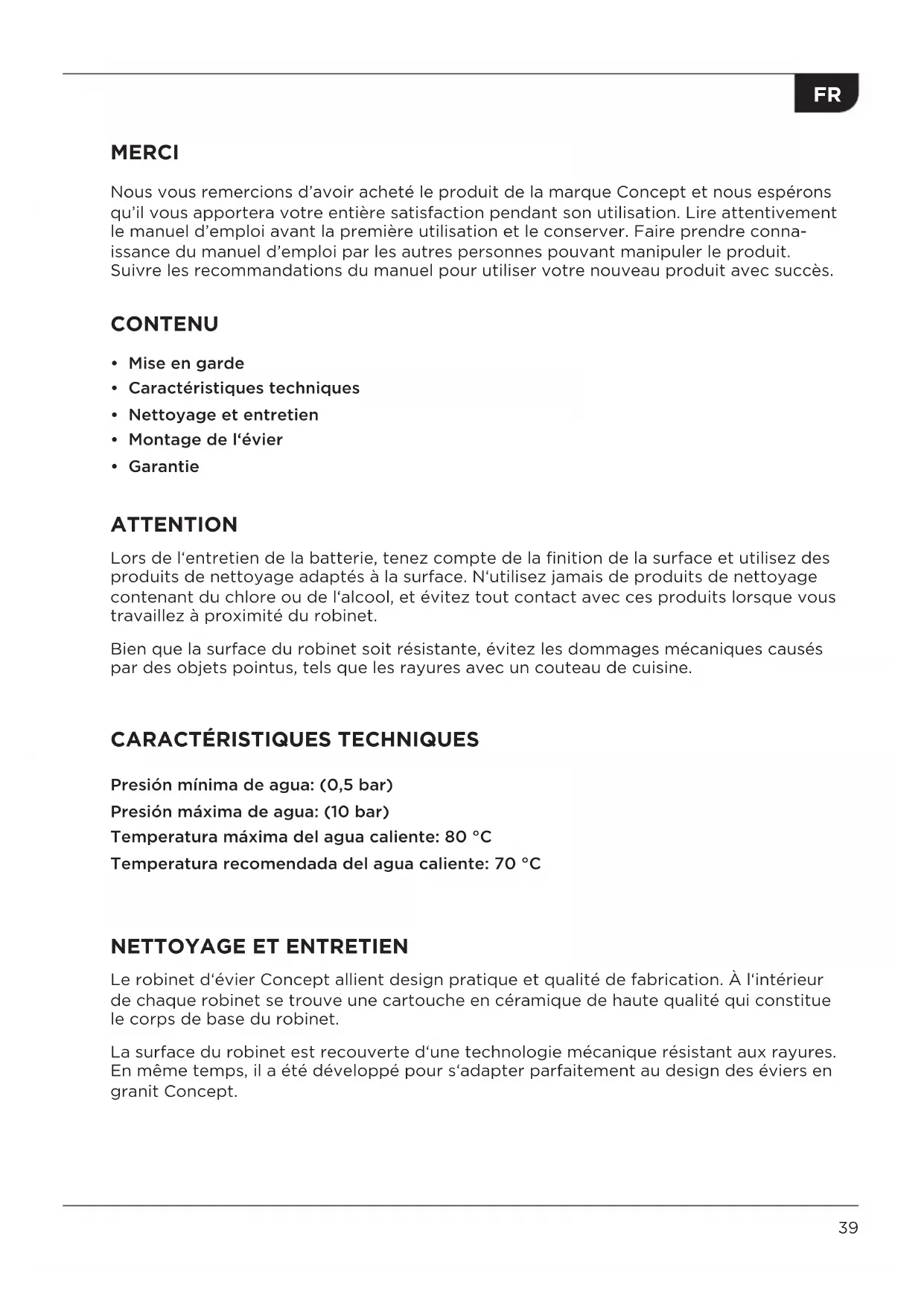 - Garantie ATTENTION Lors de l‘entretien de la batterie, tenez compte de la finition de la surface et utilisez des produits de nettoyage adaptés à la surface. N‘utilisez jamais de produits de nettoyage contenant du chlore ou de l‘alcool, et évitez tout contact avec ces produits lorsque vous travaillez à proximité du robinet. Bien que la surface du robinet soit résistante, évitez les dommages mécaniques causés par des objets pointus, tels que les rayures avec un couteau de cuisine.