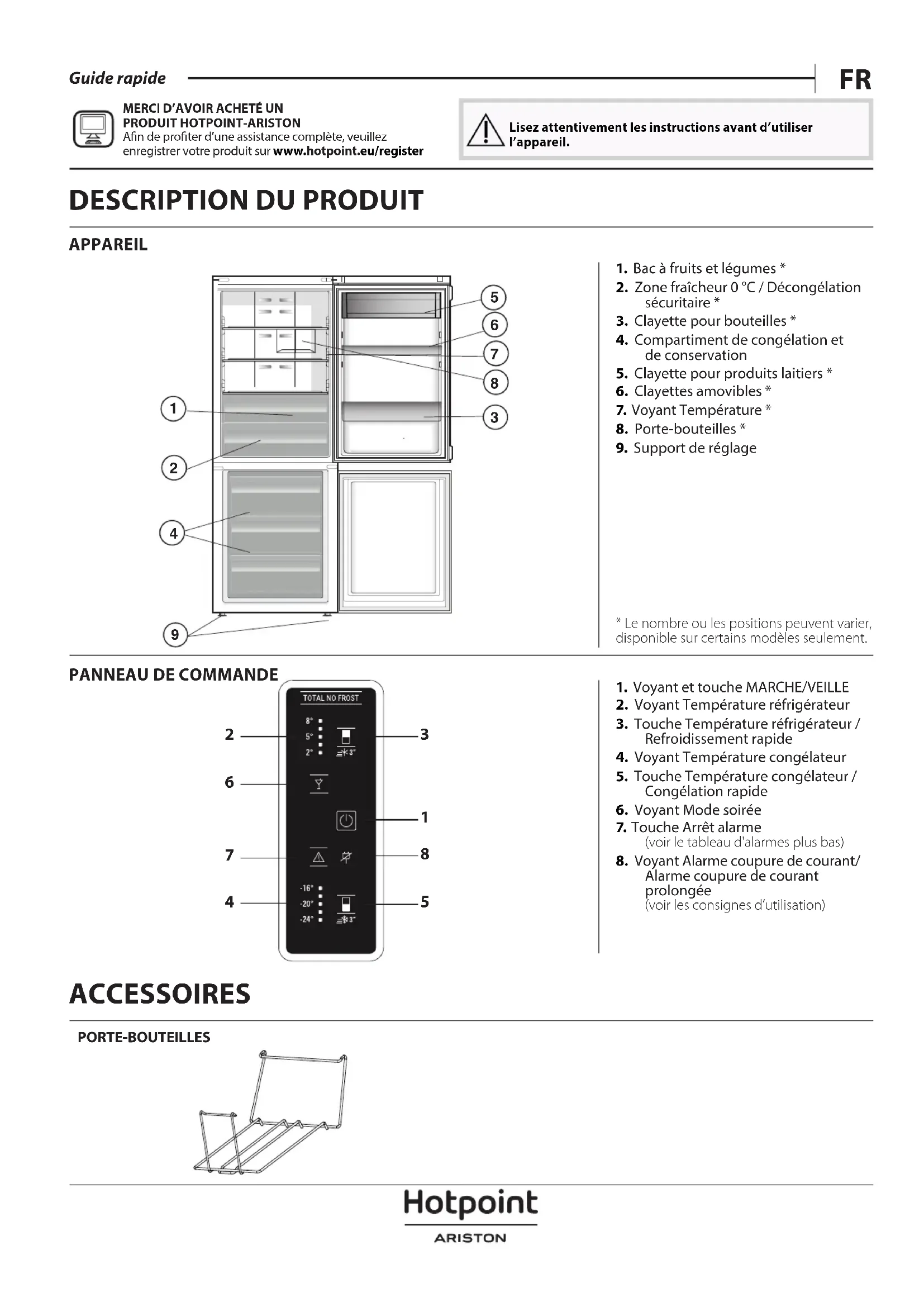 MERCI D’AVOIR ACHETÉ UN PRODUIT HOTPOINT-ARISTONAn de proter d’une assistance complète, veuillez enregistrer votre produit sur www . hotpoint .eu/ register Lisez attentivement les instructions avant d’utiliser l’appareil. ACCESSOIRES