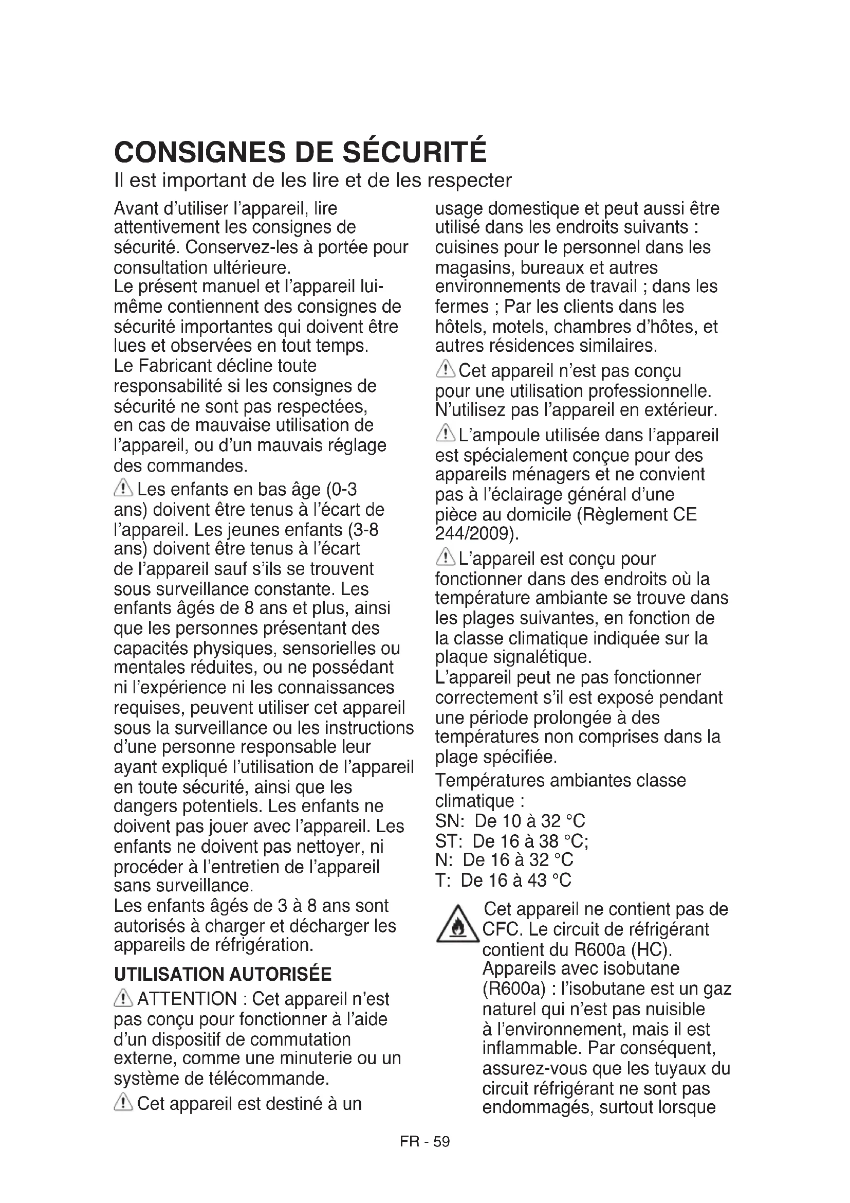 ATTENTION : Cet appareil n’est pas conçu pour fonctionner à l’aide d’un dispositif de commutation externe, comme une minuterie ou un système de télécommande. Cet appareil est destiné à un usage domestique et peut aussi être utilisé dans les endroits suivants : cuisines pour le personnel dans les magasins, bureaux et autres environnements de travail ; dans les fermes ; Par les clients dans les hôtels, motels, chambres d’hôtes, et autres résidences similaires. Cet appareil n’est pas conçu pour une utilisation professionnelle. N’utilisez pas l’appareil en extérieur. L’ampoule utilisée dans l’appareil est spécialement conçue pour des appareils ménagers et ne convient pas à l’éclairage général d’une pièce au domicile (Règlement CE 244/2009). L’appareil est conçu pour fonctionner dans des endroits où la température ambiante se trouve dans les plages suivantes, en fonction de la classe climatique indiquée sur la plaque signalétique. L’appareil peut ne pas fonctionner correctement s’il est exposé pendant une période prolongée à des températures non comprises dans la plage spéciée. Températures ambiantes classe climatique : SN: De 10 à 32 °C ST: De 16 à 38 °C; N: De 16 à 32 °C T: De 16 à 43 °C Cet appareil ne contient pas de CFC. Le circuit de réfrigérant contient du R600a (HC). Appareils avec isobutane (R600a) : l’isobutane est un gaz naturel qui n’est pas nuisible à l’environnement, mais il est inammable. Par conséquent, assurez-vous que les tuyaux du circuit réfrigérant ne sont pas endommagés, surtout lorsqueFR - 60 vous videz le circuit réfrigérant.