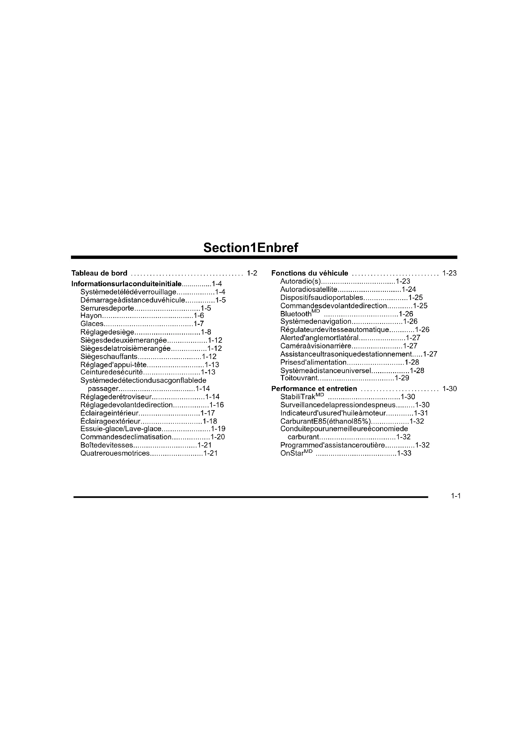 - : Témoin d'anomalie : : Pression d'huile g : Rétroviseurs extérieurs rabattables à commande électrique } : Alimentation / : Démarrage à distance du véhicule > : Rappels de ceinture de sécurité 7 : Surveillance de la pression des pneus _ : Mode remorquage F : Traction asservie M : Liquide de lave-glace v2 NOTES viSection 1 En bref Tableau de bord . . . . . . . . . . . . . . . . . . . . . . . . ............ 1-2 Information sur la conduite initiale . . . . . . . . . . . . . . . 1-4 Système de télédéverrouillage . . . . . . . . . . . . . . . . . . 1-4 Démarrage à distance du véhicule . . . . . . . . . . . . . . 1-5 Serrures de porte . . . . . . . . . . . . . . . . . . . . . . . . . . . . . . . 1-5 Hayon . . . . . . . . . . . . . . . . . . . . . . . . . . . . . .. ... . . .. . . . .. 1-6 Glaces . . . . . . . . . . . . . . . . . . . . . . . . . . . . . . . . . . . . . . . . . . 1-7 Réglage de siège . . . . . . . . . . . . . . . . . . . . . . . . . . . . . . . 1-8 Sièges de deuxième rangée . . . . . . . . . . . . . . . . . . . 1-12 Sièges de la troisième rangée . . . . . . . . . . . . . . . . . 1-12 Sièges chauffants . . . . . . . . . . . . . . . . . . . . . . . . . . . . . . 1-12 Réglage d'appui-tête . . . . . . . . . . . . . . . . . . . . . . . . . . . 1-13 Ceinture de sécurité . . . . . . . . . . . . . . . . . . . . . . . . . . . 1-13 Système de détection du sac gonflable de passager . . . . . . . . . . . . . . . . . . . . . . . . . . . . . . . . . . . . 1-14 Réglage de rétroviseur . . . . . . . . . . . . . . . . . . . . . . . . . 1-14 Réglage de volant de direction . . . . . . . . . . . .. . . . . 1-16 Éclairage intérieur . . .. . . . . . . . . . . . . . . . . . . . . . . . . . 1-17 Éclairage extérieur . . . . . . . . . . . . . . . . . . . . . . . . . . . . . 1-18 Essuie-glace/Lave-glace . . . . . . . . . . . . . . . . . . . . . . . 1-19 Commandes de climatisation . . . . . . . . . . . . . . . . . . 1-20 Boîte de vitesses . .. . . . . . . . . . . . . . . . . . . . . . . . . . . . 1-21 Quatre roues motrices . . . . . . . . . . . . . . . . . . . . . . . . . 1-21 Fonctions du véhicule . . . . . . . . . . . . . . . . . . . . . . . . . . . . 1-23 Autoradio(s) . . . . . . . . . . . . . . . . . . . . . . . . . . . . . . . . . . . 1-23 Autoradio satellite . . . . . . . . . . . . . . . . . .. . . . . . . . . . . . 1-24 Dispositifs audio portables . . . . . . . . . . . . . . . . . . . . . 1-25 Commandes de volant de direction . . . . . . . . . . . . 1-25 Bluetooth