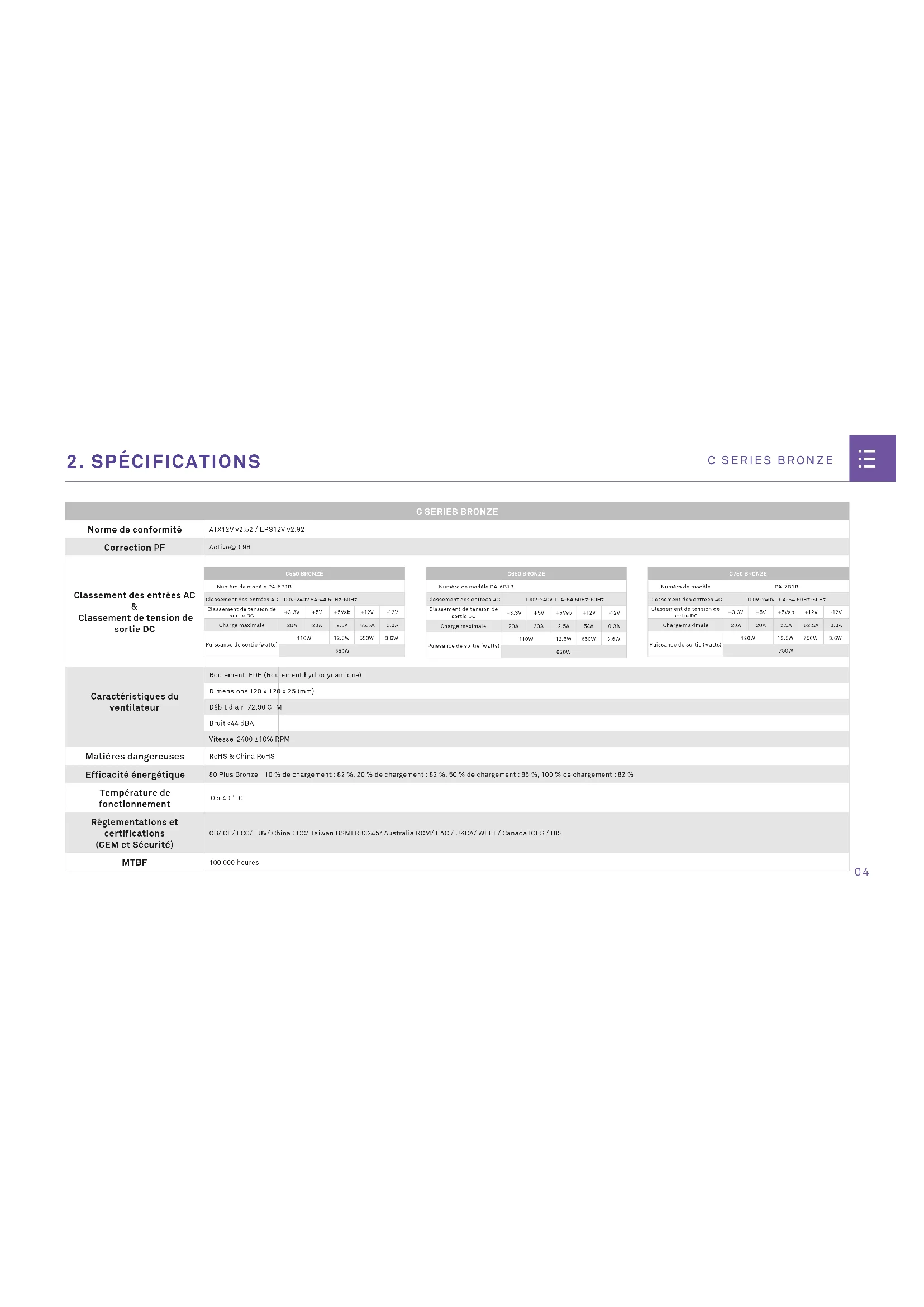 Norme de conformité ATX12V v2.52 / EPS12V v2.92 Correction PF Active@0.96 Classement des entrées AC